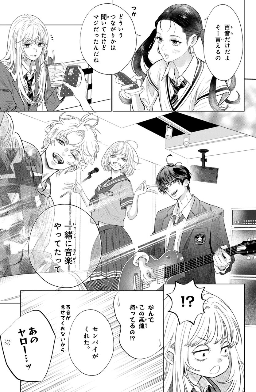 青春がほとばしるような写真! ……でも過去形です。ボーカルの百音の右側にいるのがギターの“快音(かいと)君”。彼は2年半前に交通事故で亡くなり、バンドは自然消滅しました。当時14歳だった百音は16歳になって、友達と遊んだりバイトしたり、それなりに楽しくやっています。でもカラオケには行きません。そして快音君からもらった指輪をずっと肌身離さず持っています。