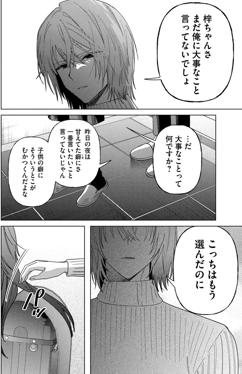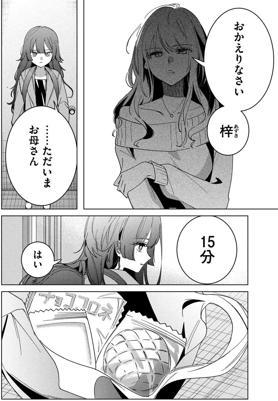 両者に同意があったとしても、保護者の同意なしに18歳未満の児童の連れ出し、同伴、とどめることは青少年保護育成条例に抵触する。遥川悠真は、それを知ってのうえで梓に食事を与え、寝場所を与え、枕元で寝物語まで話してやる。それは、梓の身の上話を聞いてしまったからか? ならば、それは同情だ。段ボール箱に詰められて、クゥンクゥン泣いている仔犬を可哀想に思い、家に連れ帰るのは人間の善性かもしれないが、その仔犬が死を迎えるまで飼い続けることは、同情や善性に支えられるものではない。しかし翌朝、学校に行く梓に遥川悠真はこう言うのだ。