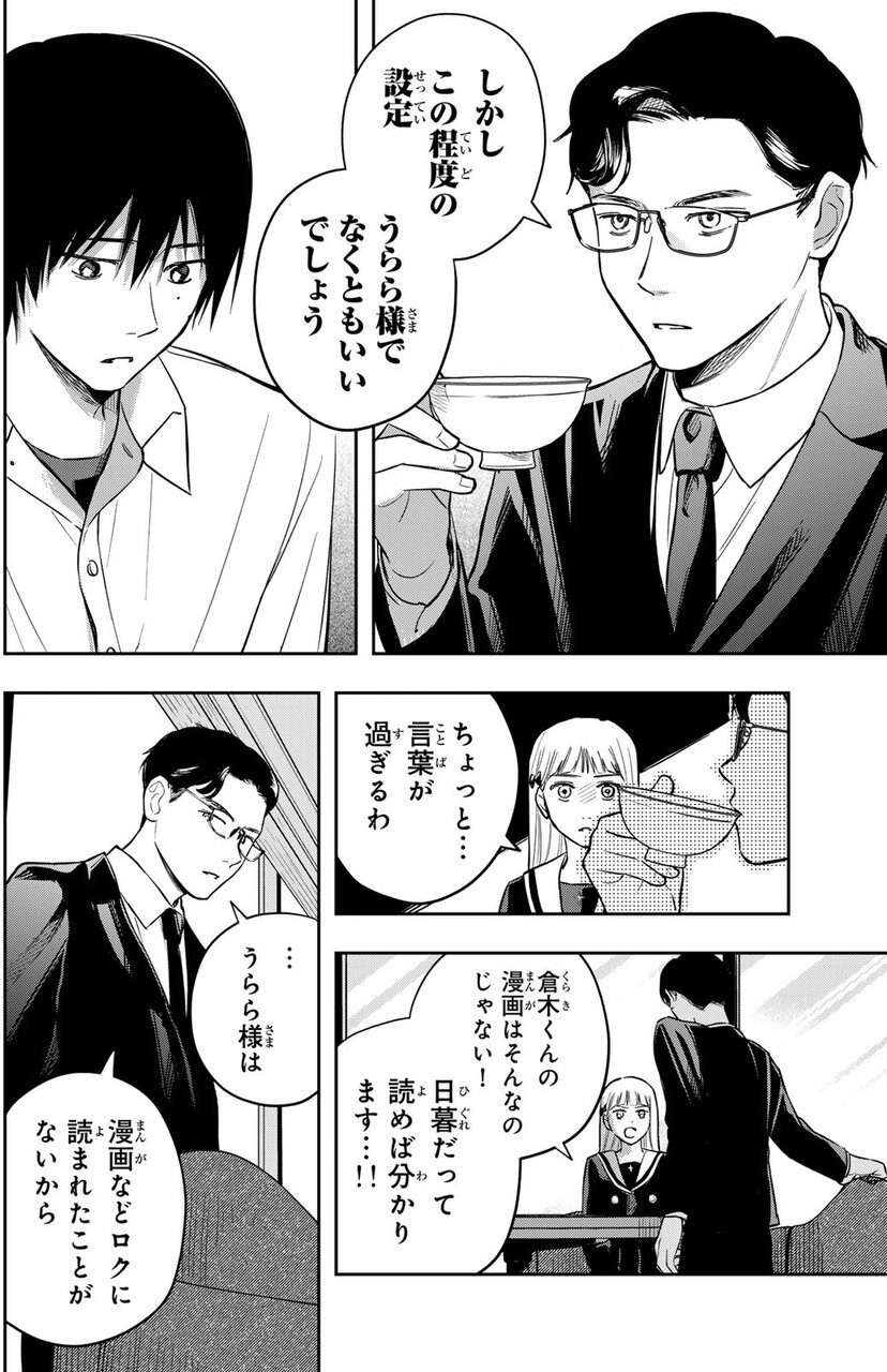 ふたりの関係の障害になるのは、春野さんの送迎ドライバーにして、身の回りのお目付け役・日暮さん。倉木くんが春野さんをモデルに漫画を描いていることを知って、キツい一言を放つ!