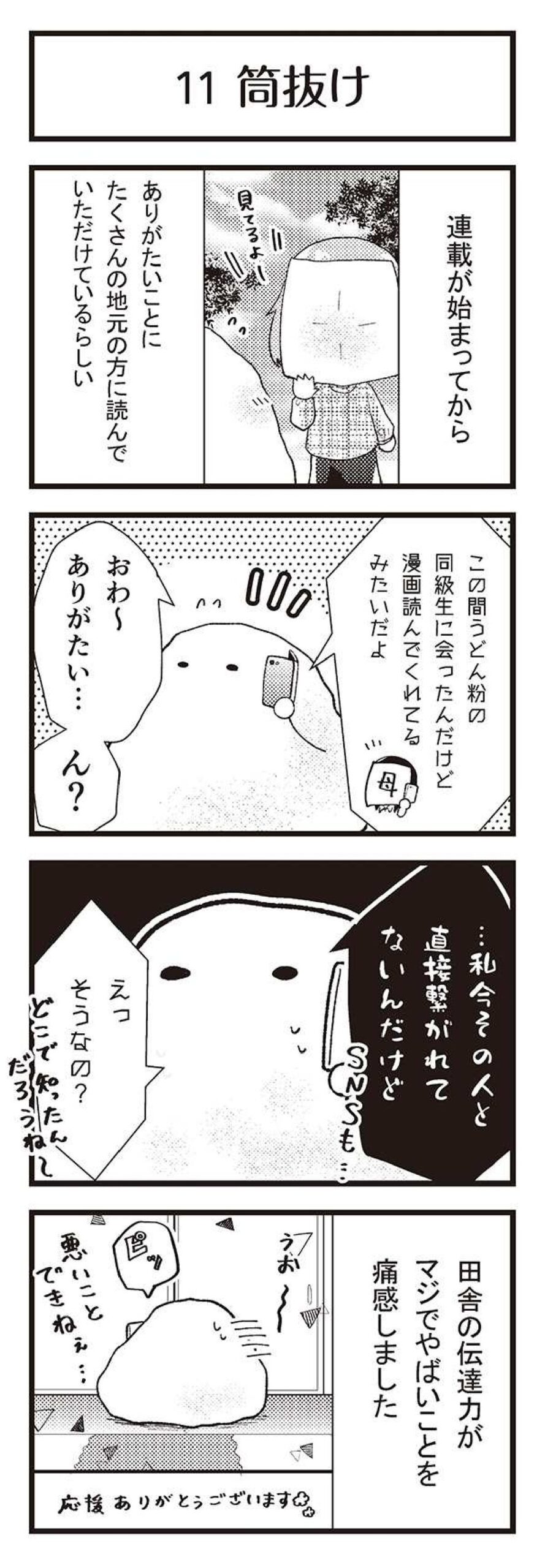 「限界集落」とは、「家を継ぐ若者が流出して、社会的な共同作業が困難になった共同体」を指す言葉です。本作は、限界集落に住む著者のうどん粉さんが、すれ違う人は全員親戚、バスは1日1本の、地元の限界集落の生活をハートフルに綴った4コマ漫画です。