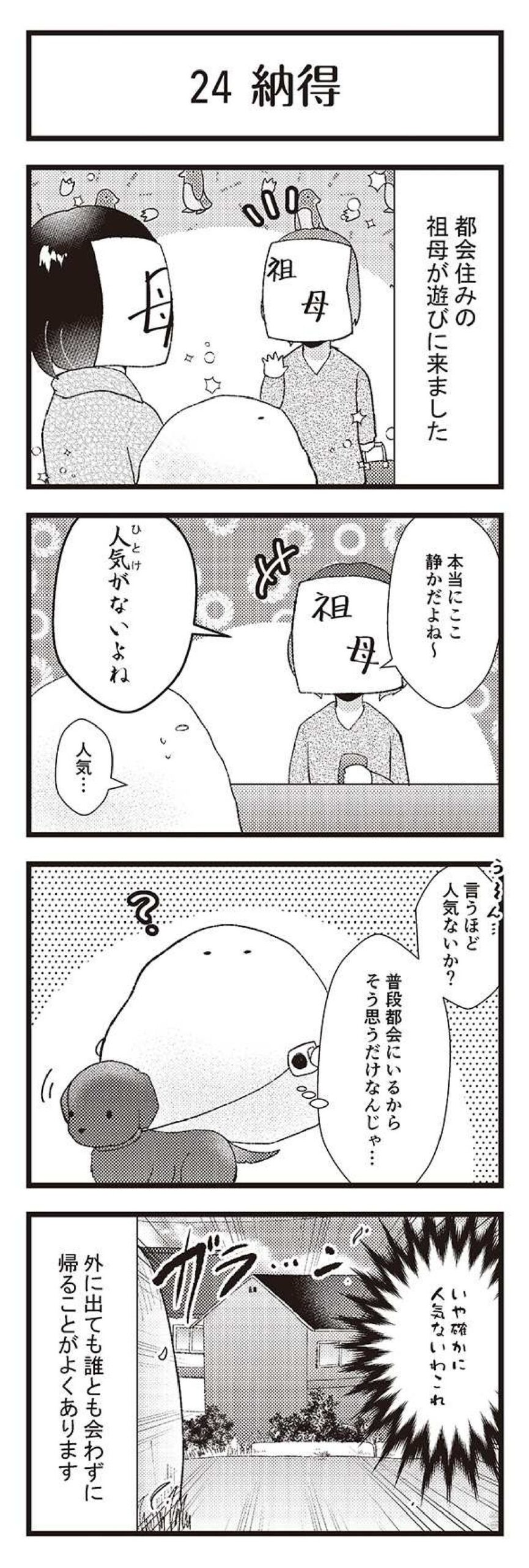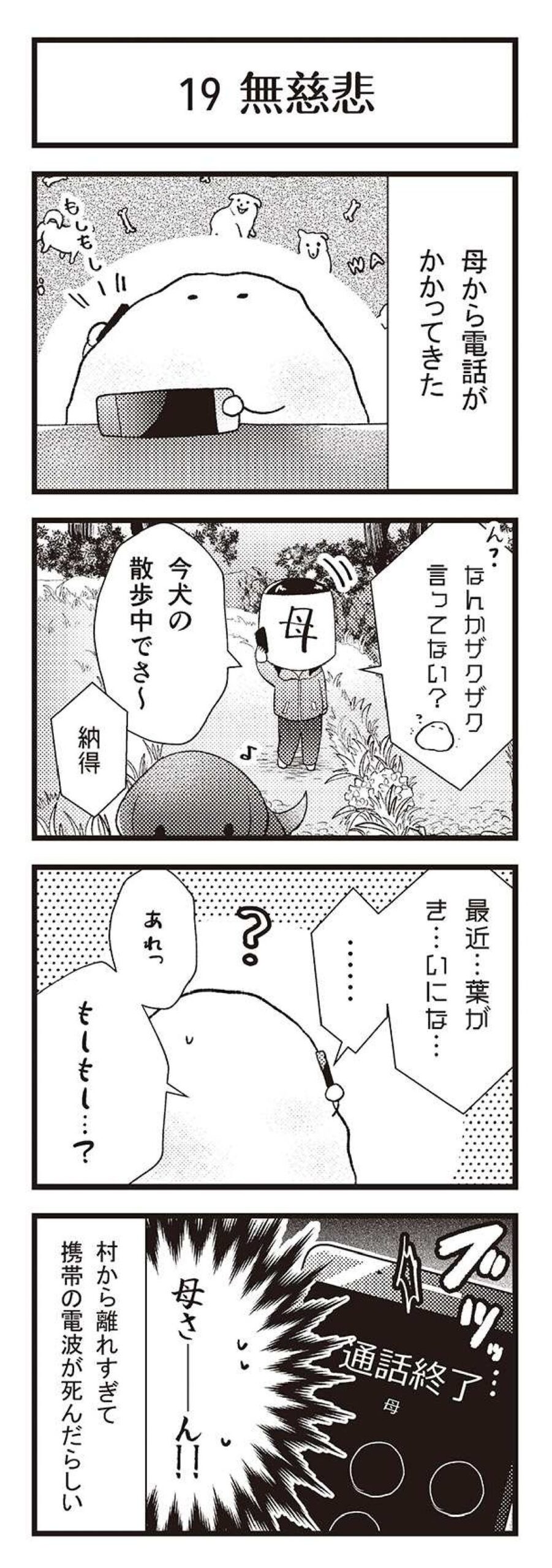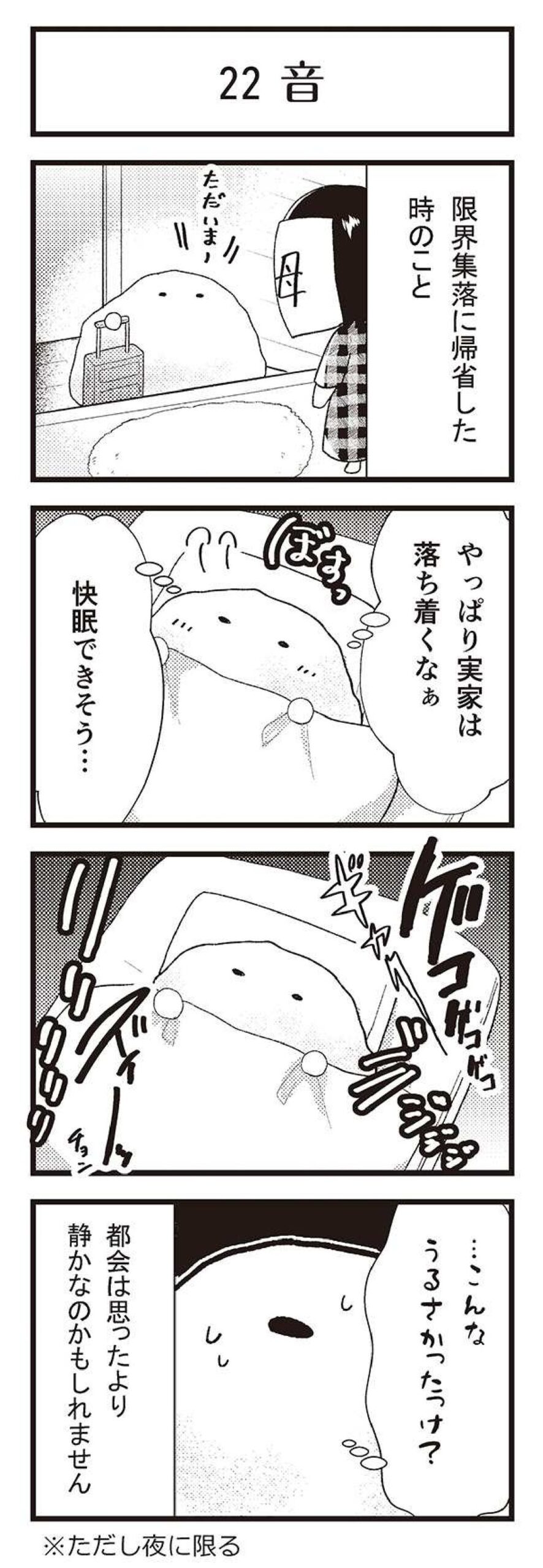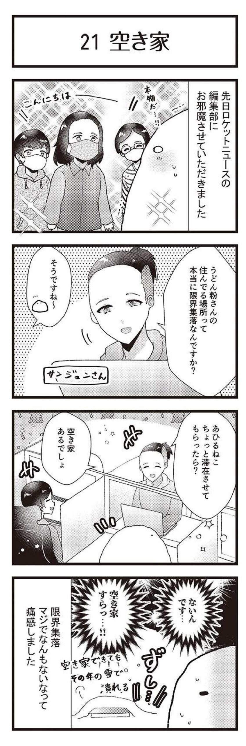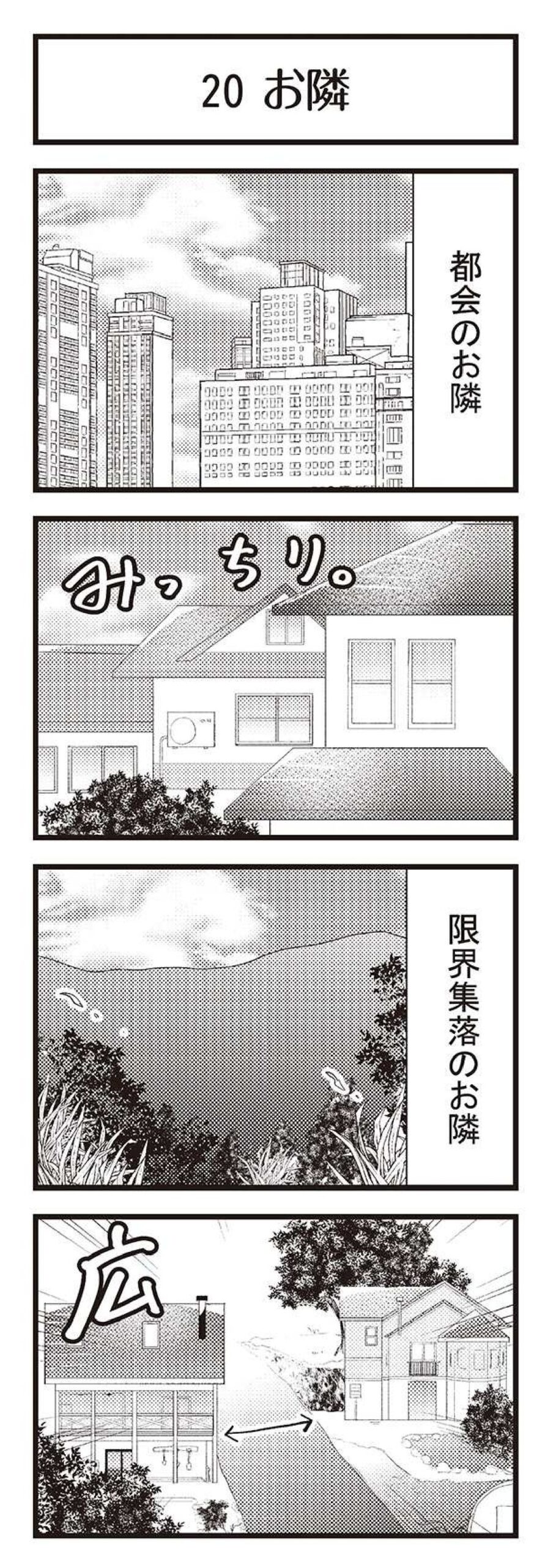 「限界集落」とは、「家を継ぐ若者が流出して、社会的な共同作業が困難になった共同体」を指す言葉です。本作は、限界集落に住む著者のうどん粉さんが、すれ違う人は全員親戚、バスは1日1本の、地元の限界集落の生活をハートフルに綴った4コマ漫画です。
