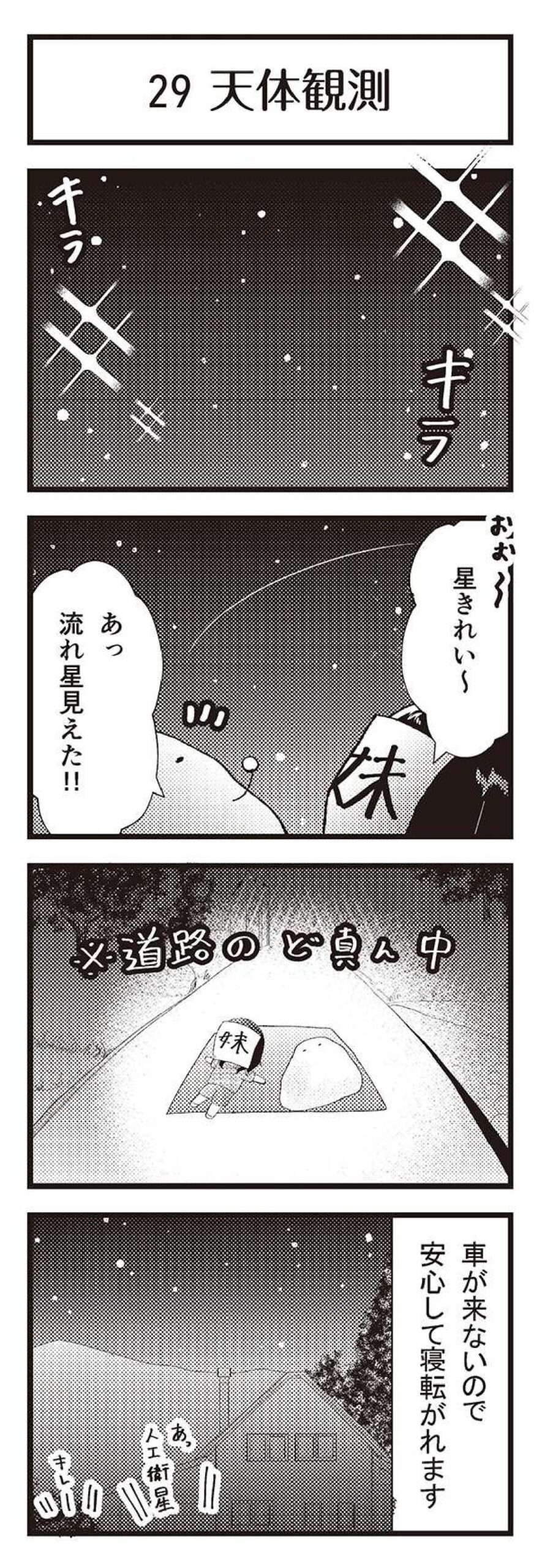 「限界集落」とは、「家を継ぐ若者が流出して、社会的な共同作業が困難になった共同体」を指す言葉です。本作は、限界集落に住む著者のうどん粉さんが、すれ違う人は全員親戚、バスは1日1本の、地元の限界集落の生活をハートフルに綴った4コマ漫画です。