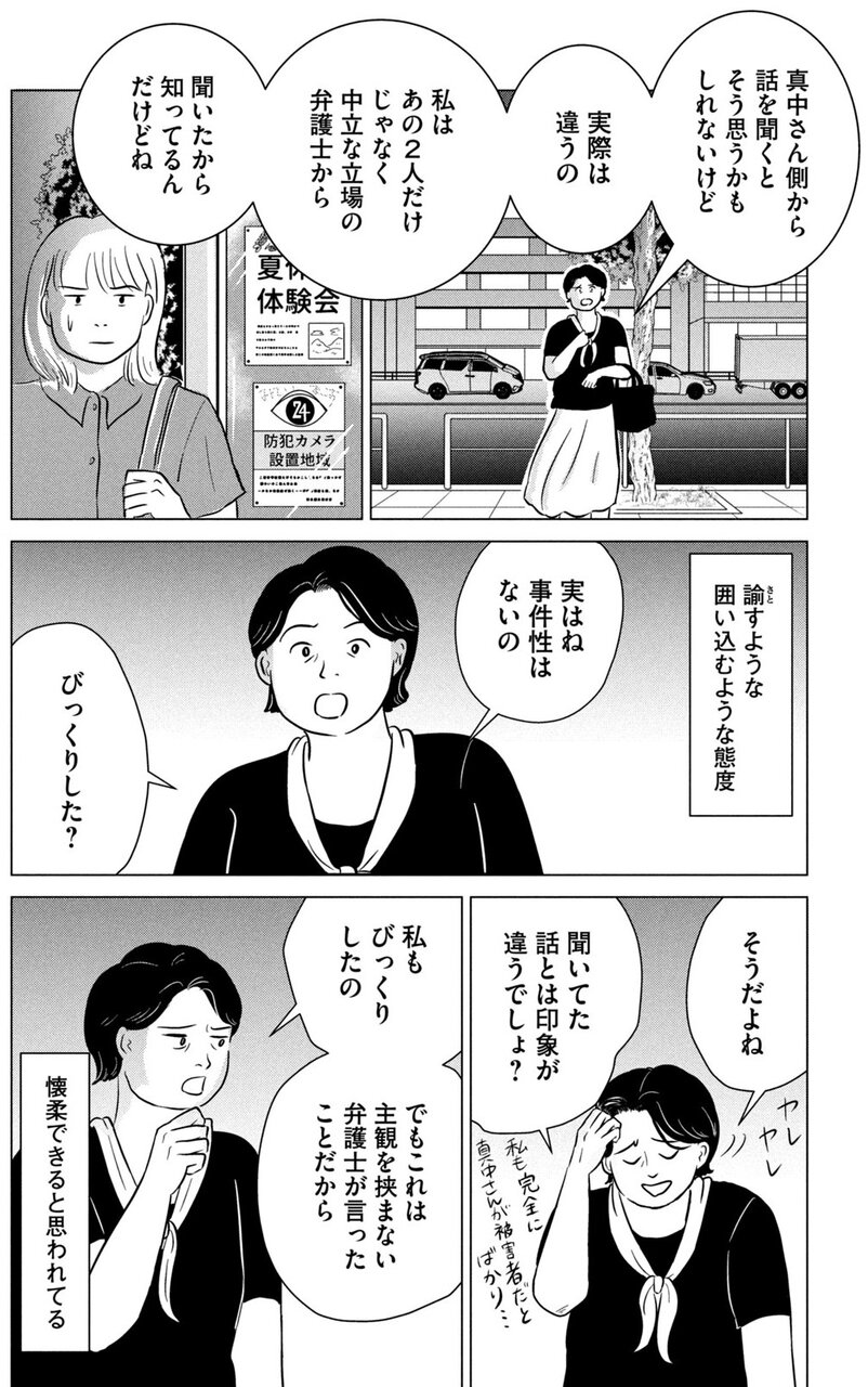しかし、この作品の凄さは、単に加害者だけを悪者として描いていないところにあります。朱里自身もまた、「真中さんてモテそうな感じだし」と、自分の中にあった“無意識の偏見”を省みるのです。