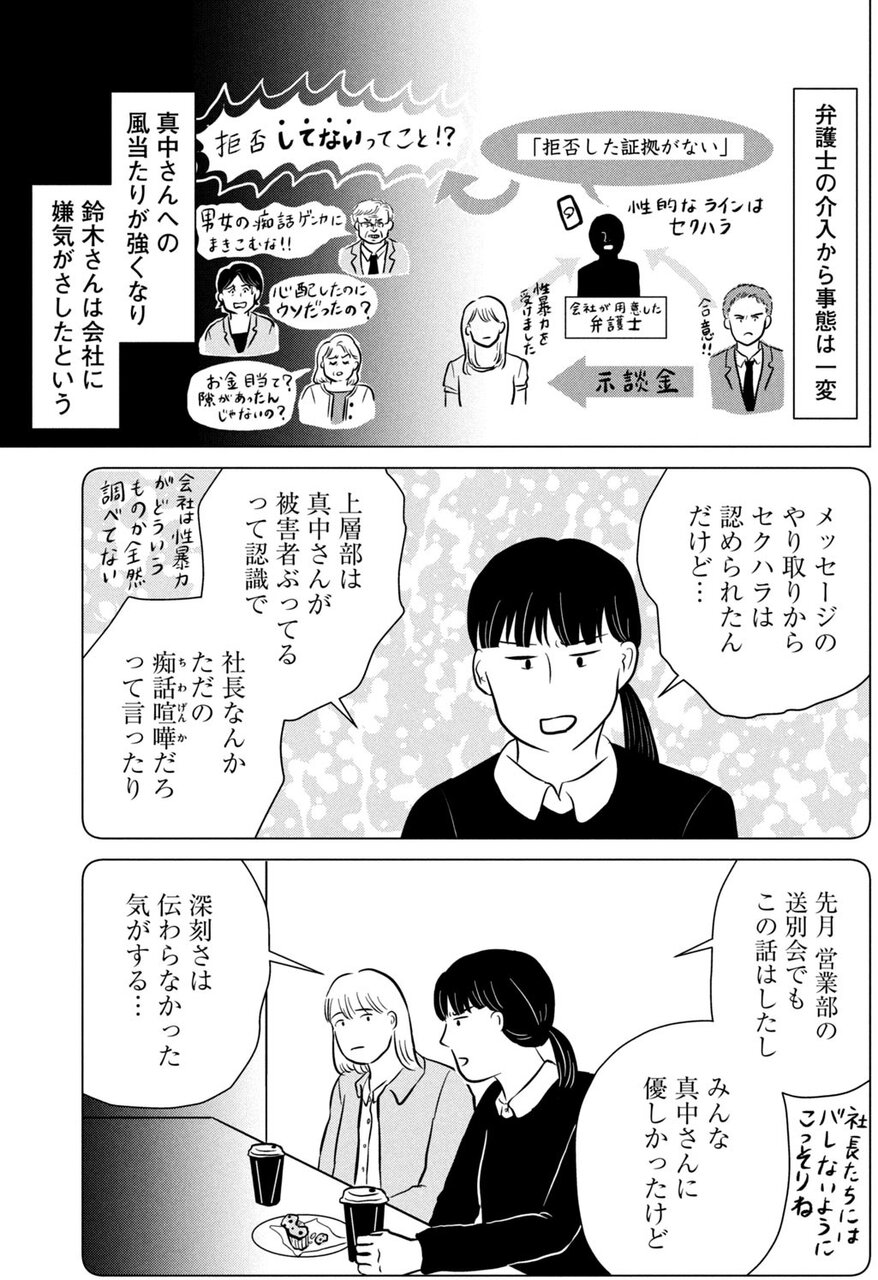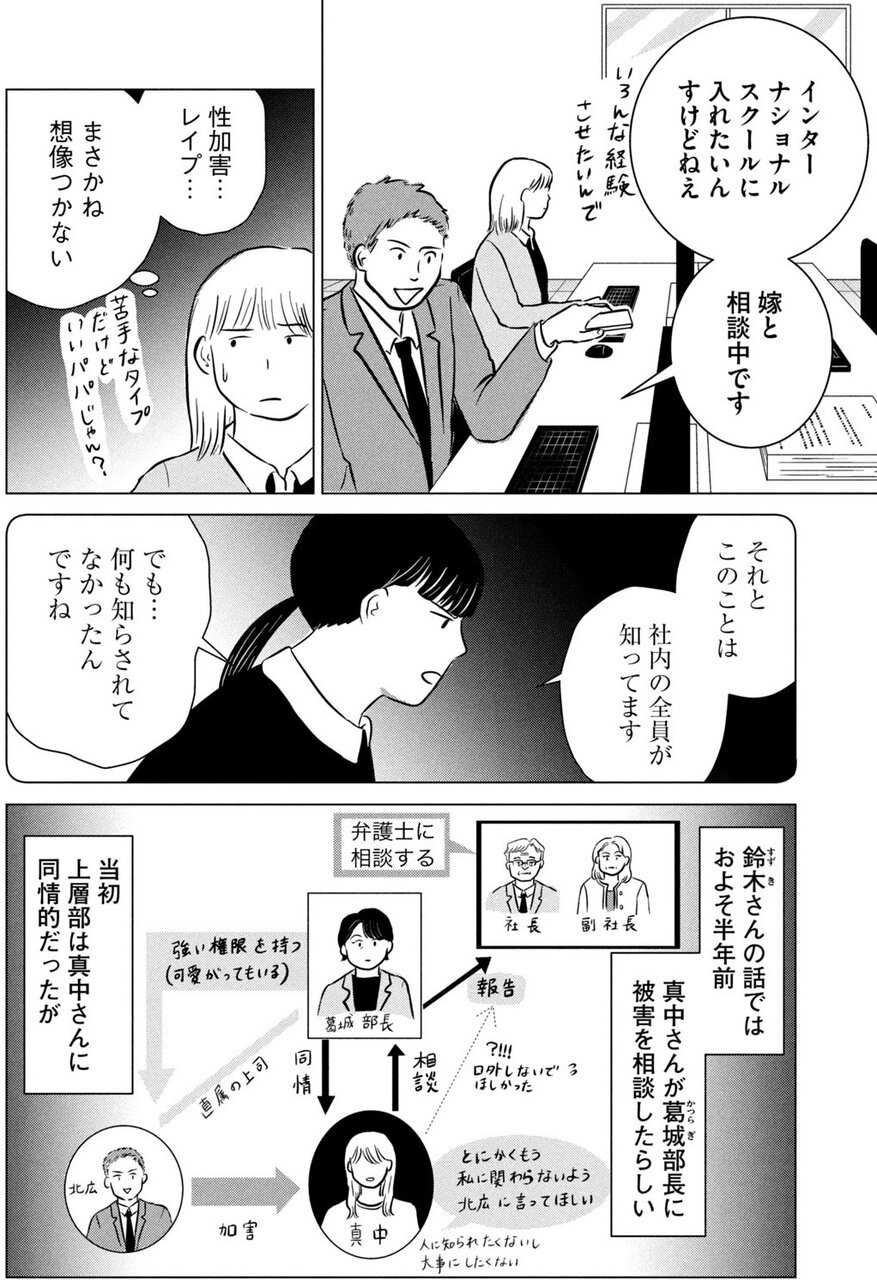 なんとも胸糞が悪い。これは、まさにセカンドレイプです。辛い出来事を思い切って上司に相談したにもかかわらず、踏みにじられていく被害者の気持ちを思うと、読んでいていたたまれなくなります。