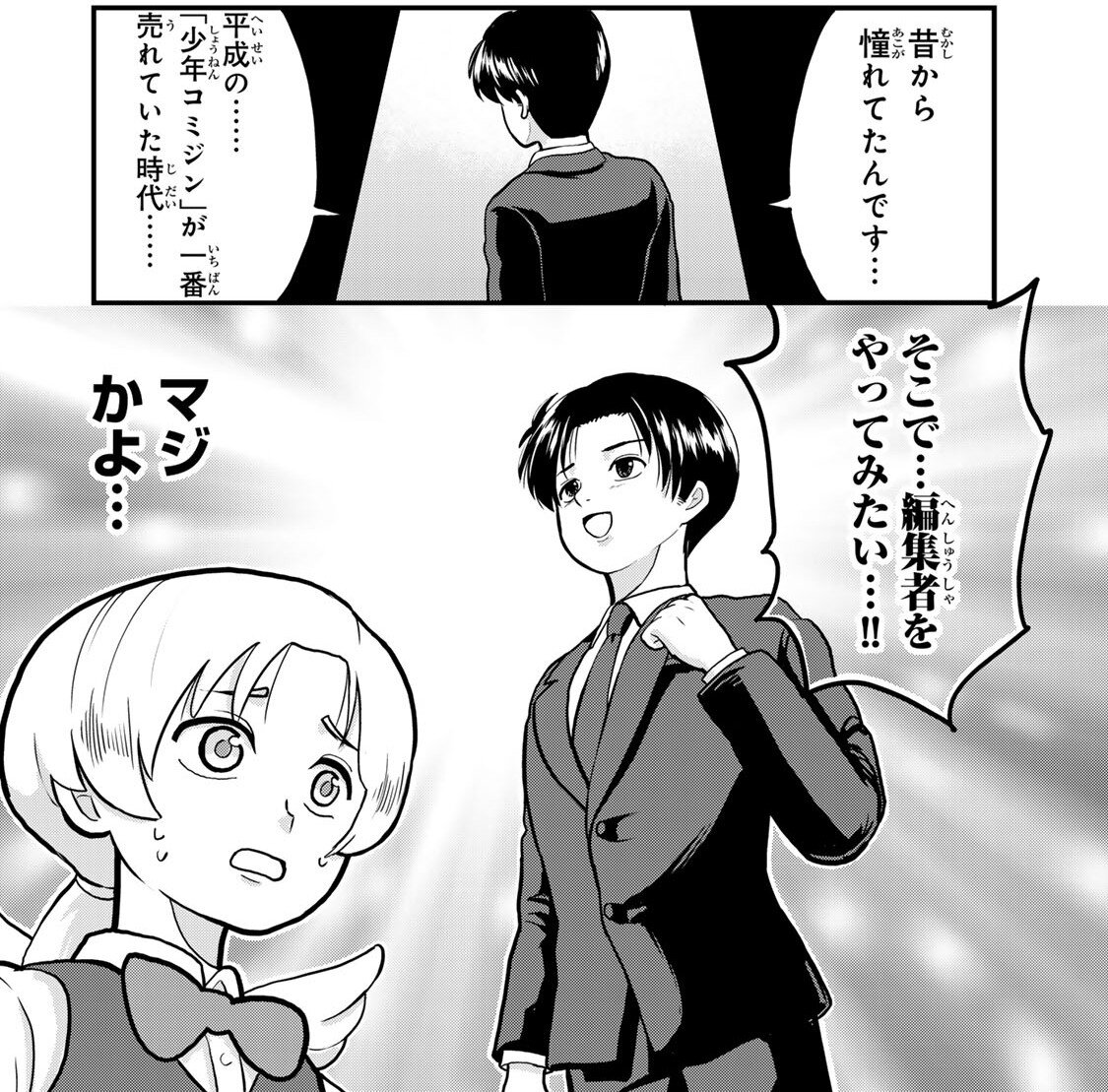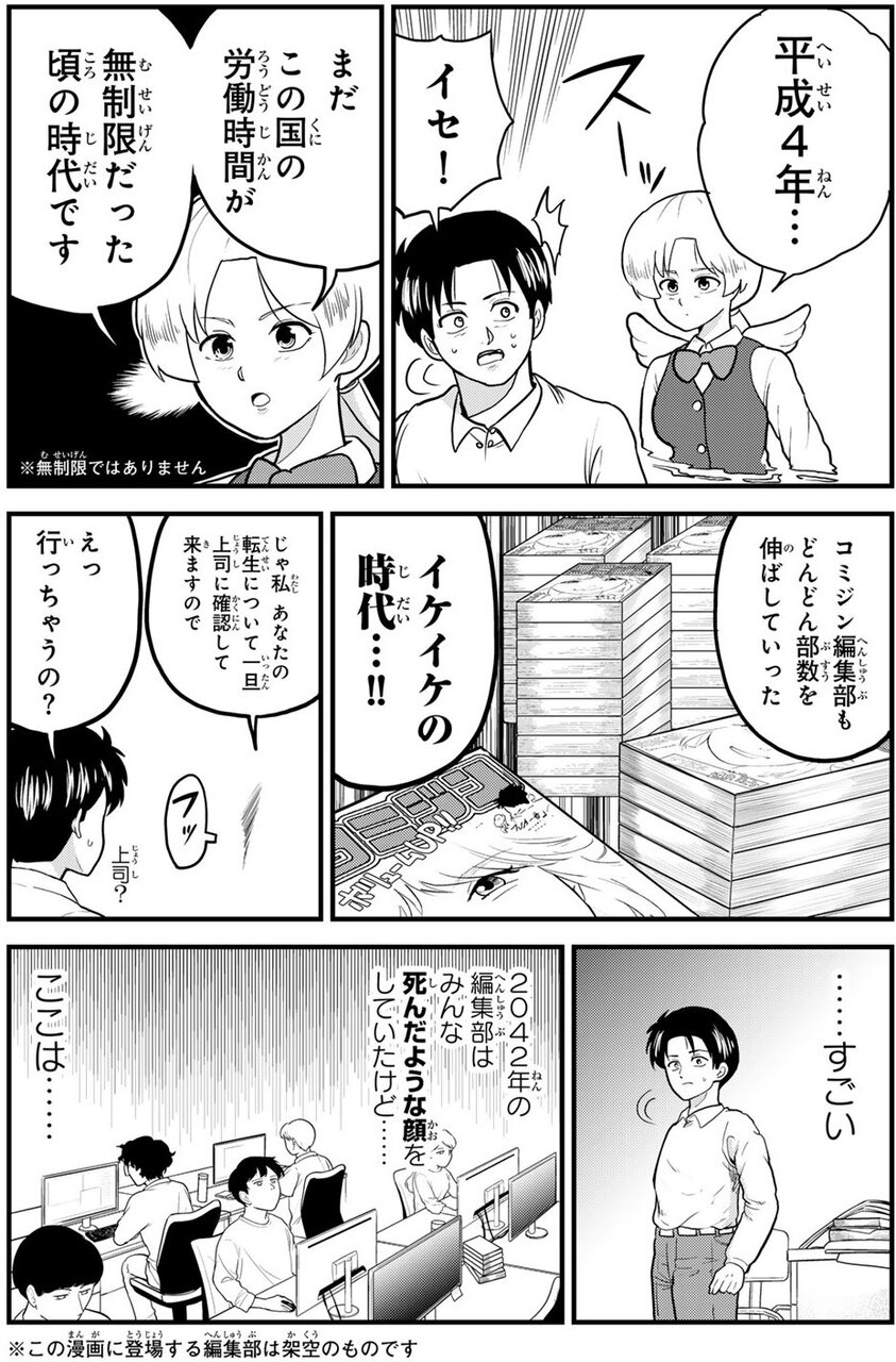 イセは絶句しているが、私は清水の気持ちがちょっとわかる。平成は異世界ではなく過去ではあるものの、まあ今となっちゃ異世界のようなものだ。イセはしぶしぶ清水を平成の平談社のマンガ編集者として転生させる。