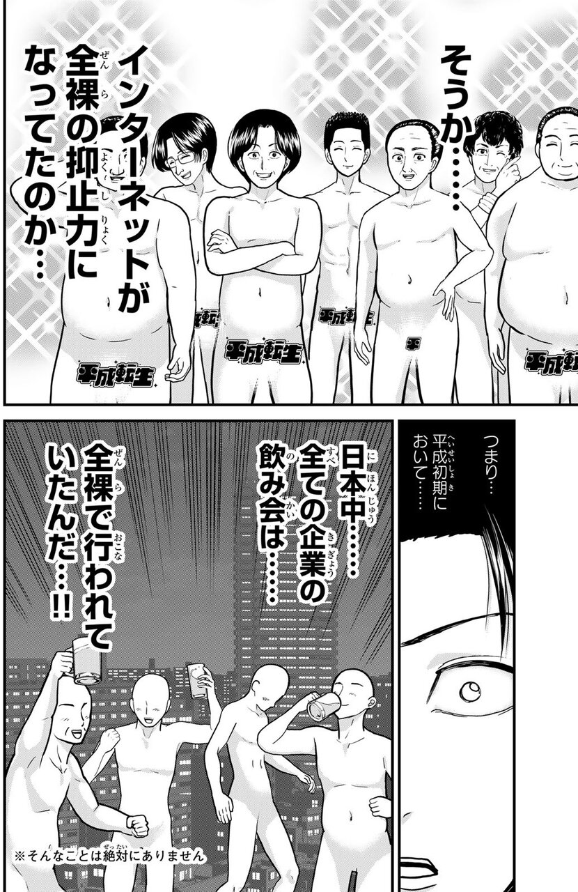 ということで『平成転生』を紹介したい。「この物語はフィクションであり、登場する人物・会社、描かれるエピソードなどはすべて架空のものです」という注釈が何度も何度も(本当に何度も!)入るギャグマンガだ。