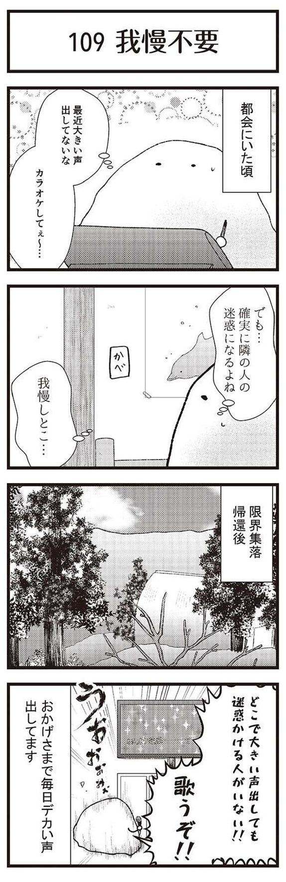 「限界集落」とは、「家を継ぐ若者が流出して、社会的な共同作業が困難になった共同体」を指す言葉です。本作は、限界集落に住む著者のうどん粉さんが、すれ違う人は全員親戚、バスは1日1本の、地元の限界集落の生活をハートフルに綴った4コマ漫画です。