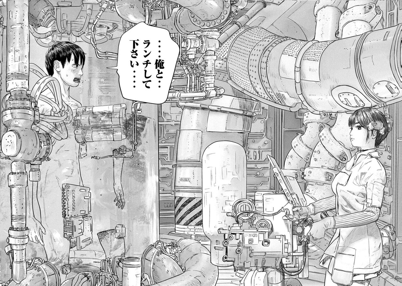 漫画家・加藤文孝。本作の作者は、絵を描き込むほどに脳内にドーパミン、ノルアドレナリン、βエンドルフィンが出てきてアゲアゲ気分が止まらなくなるタイプの作家だ(多分ね)。偏執的と言って差し支えないメカニックの描写は、メビウスやエンキ・ビラルといったバンド・デシネの漫画群や大友克洋、弐瓶勉などの流れを汲んでいることは間違いない。「侍+スチームパンクSF」という荒唐無稽な題材に挑んだ前作『空来船打払令』など、「コレや、コレや! コレが描きたいんやぁ(勝手に関西弁変換)」とばかりに、ゴツゴツとしたパイプやボルト、ボンベといった機械部品を精緻に描写。その欲求がコマに収まりきらず、見開きカットが頻出して、そのどれもが異様なテンション、かつメチャクチャカッコ良かった。作者がペンではなく、100号サイズのキャンバスと絵筆を手にしていたなら、日本を代表する現代美術の作家になっていたかもしれない(マジでそう思う)。
