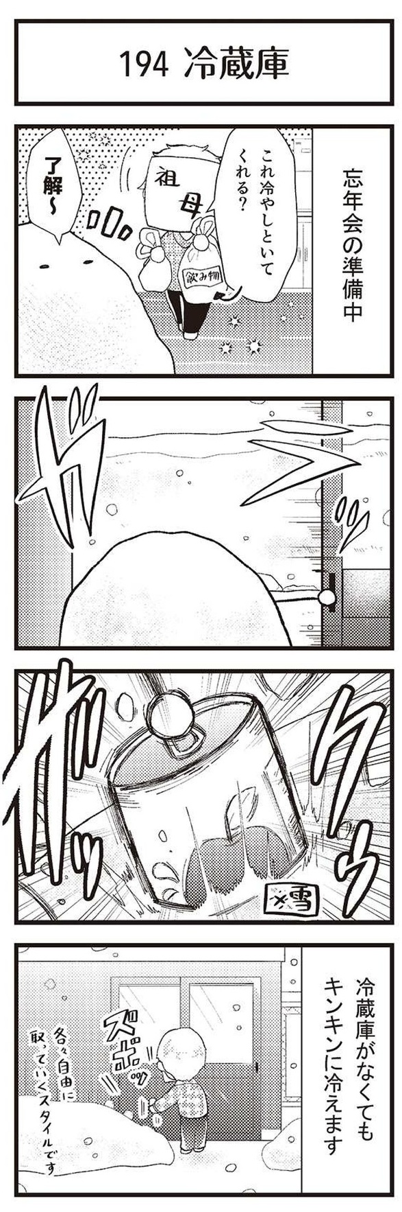 「限界集落」とは、「家を継ぐ若者が流出して、社会的な共同作業が困難になった共同体」を指す言葉です。本作は、限界集落に住む著者のうどん粉さんが、すれ違う人は全員親戚、バスは1日1本の、地元の限界集落の生活をハートフルに綴った4コマ漫画です。
