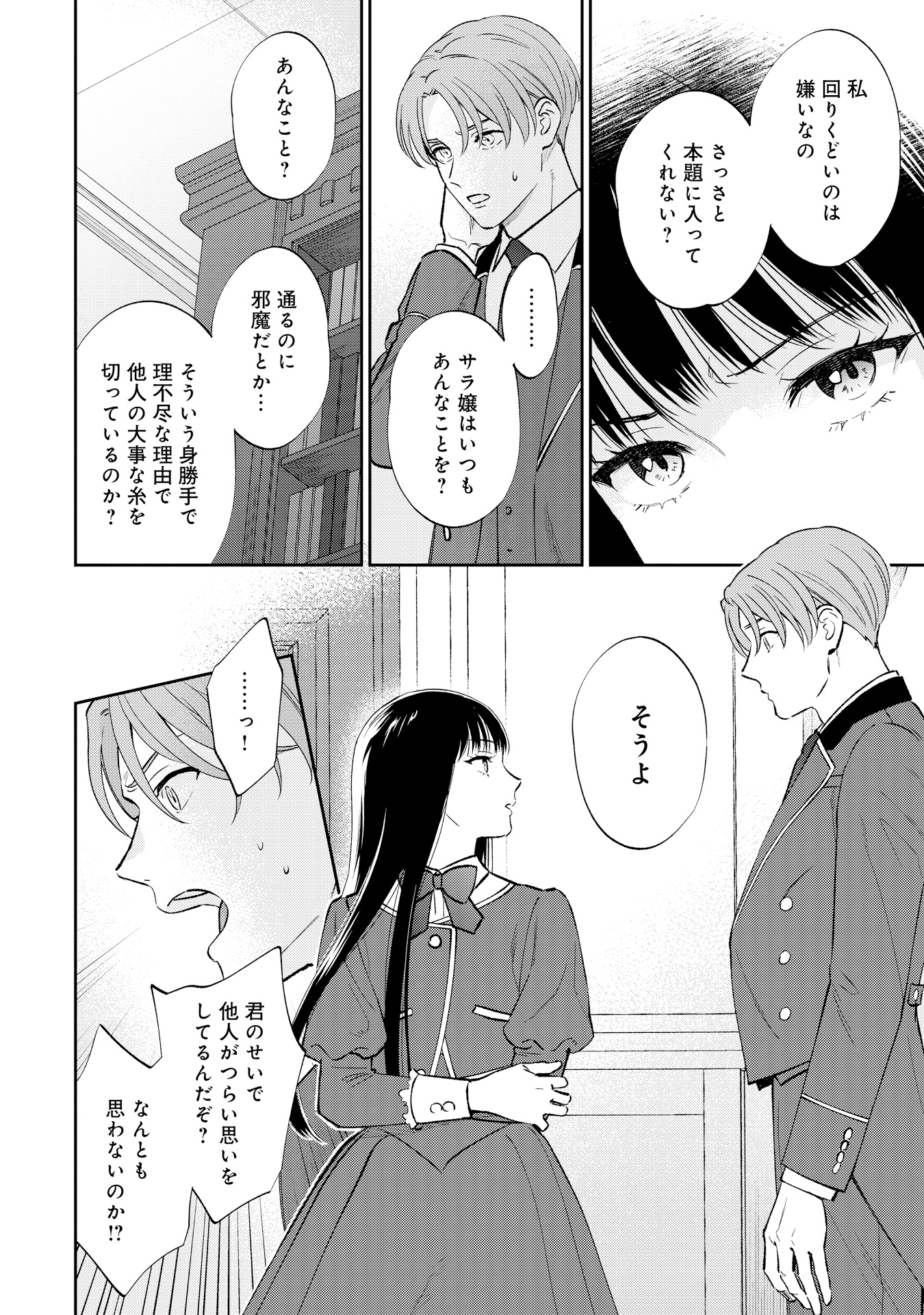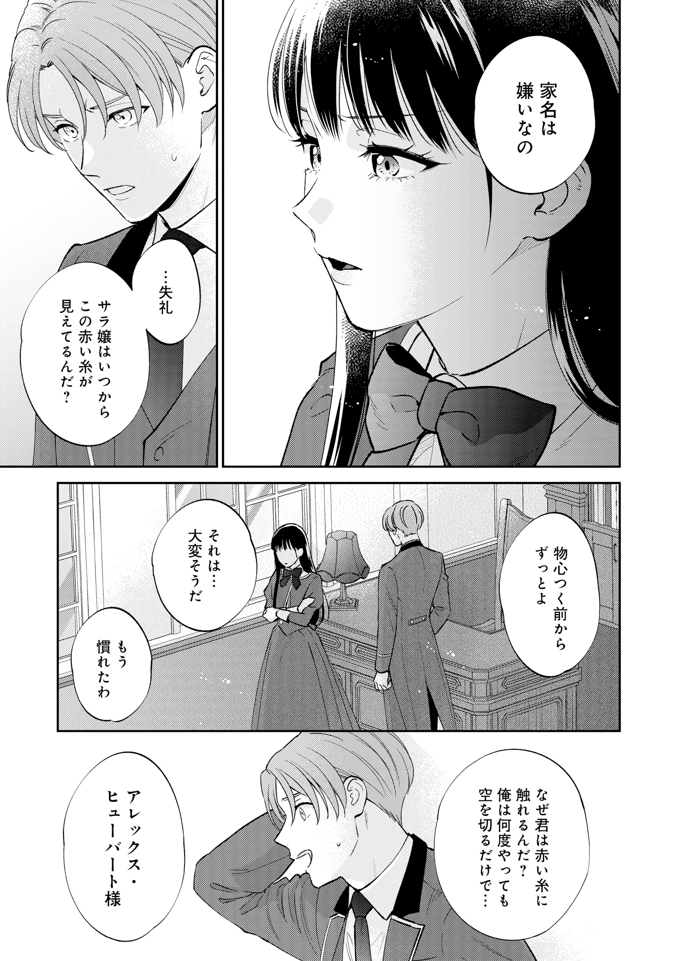 ハワード王立学園に通うアレックス・ヒューバートは、ある日突然、“運命の赤い糸”が見えるようになります。突然の変化に戸惑う中、校内で、赤い糸をハサミで切っている伯爵令嬢のサラ・クローリアに出会います。