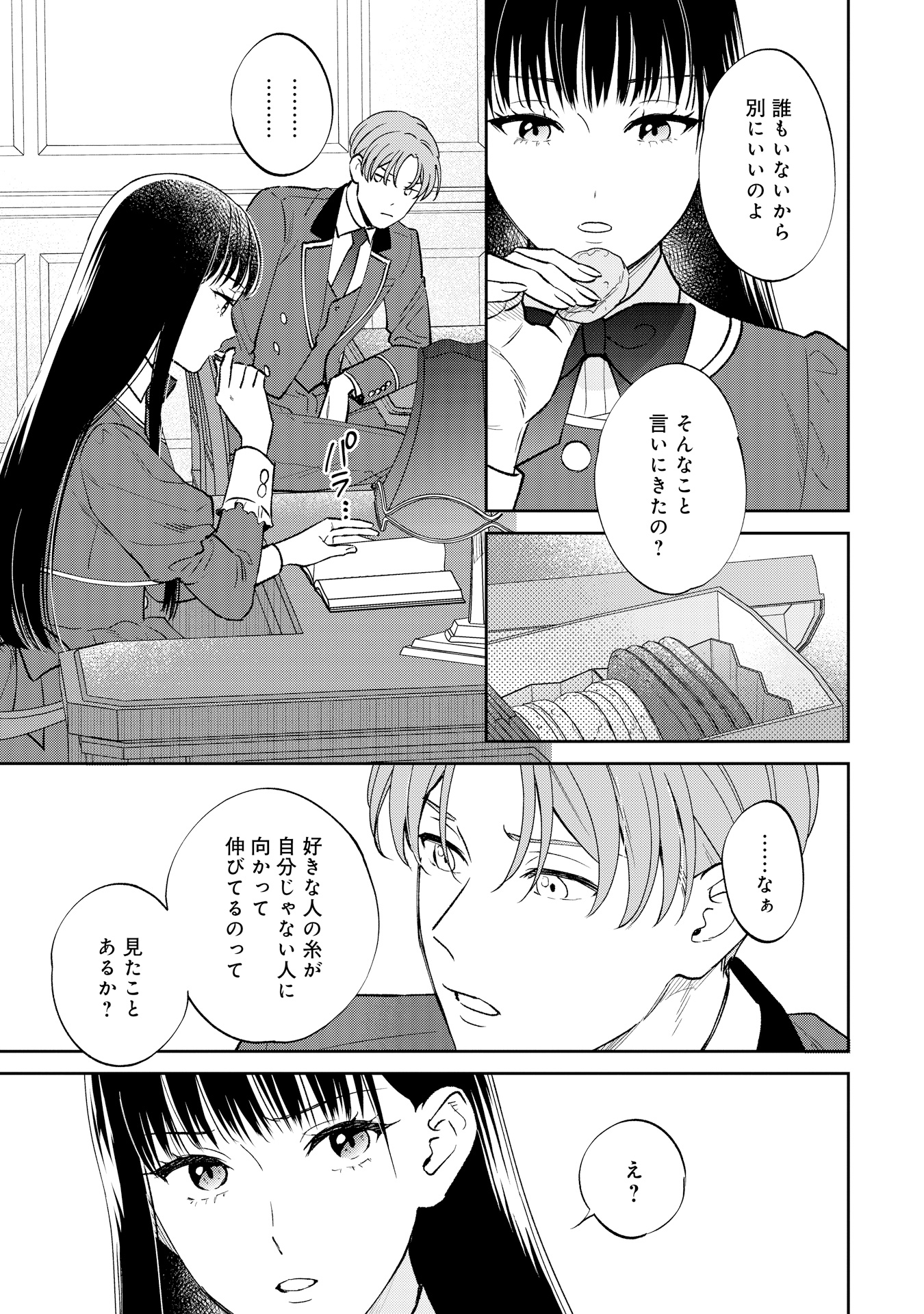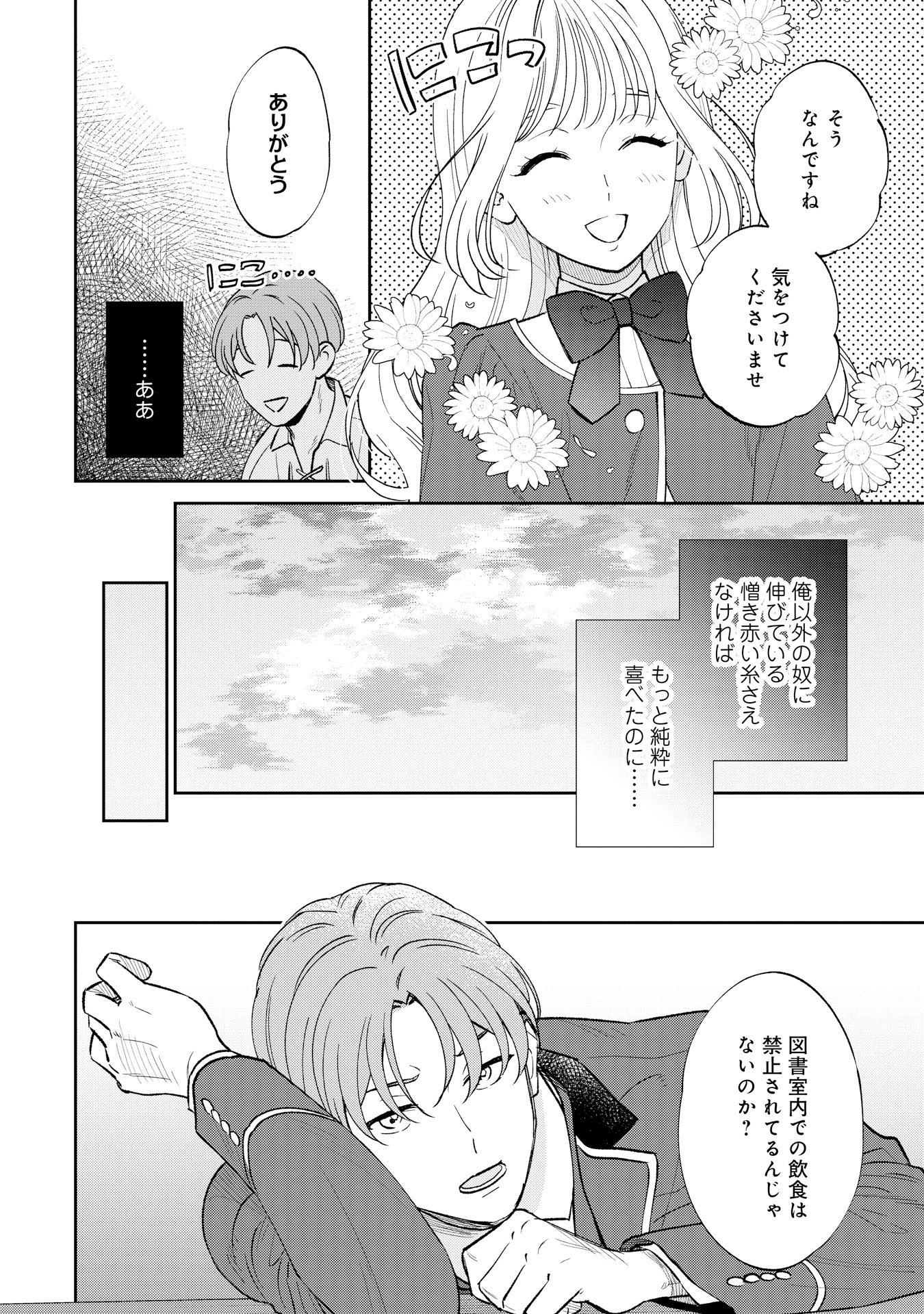 ハワード王立学園に通うアレックス・ヒューバートは、ある日突然、“運命の赤い糸”が見えるようになります。突然の変化に戸惑う中、校内で、赤い糸をハサミで切っている伯爵令嬢のサラ・クローリアに出会います。