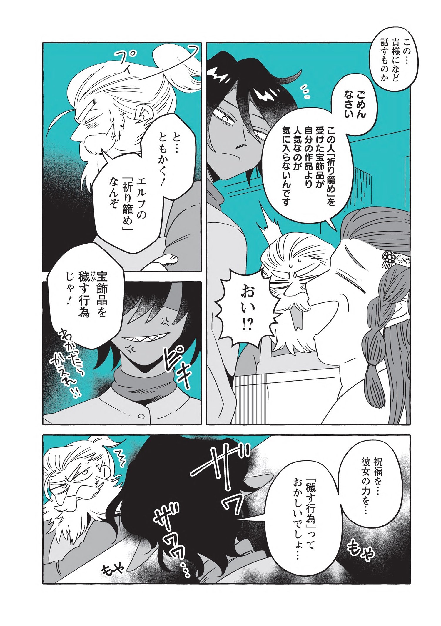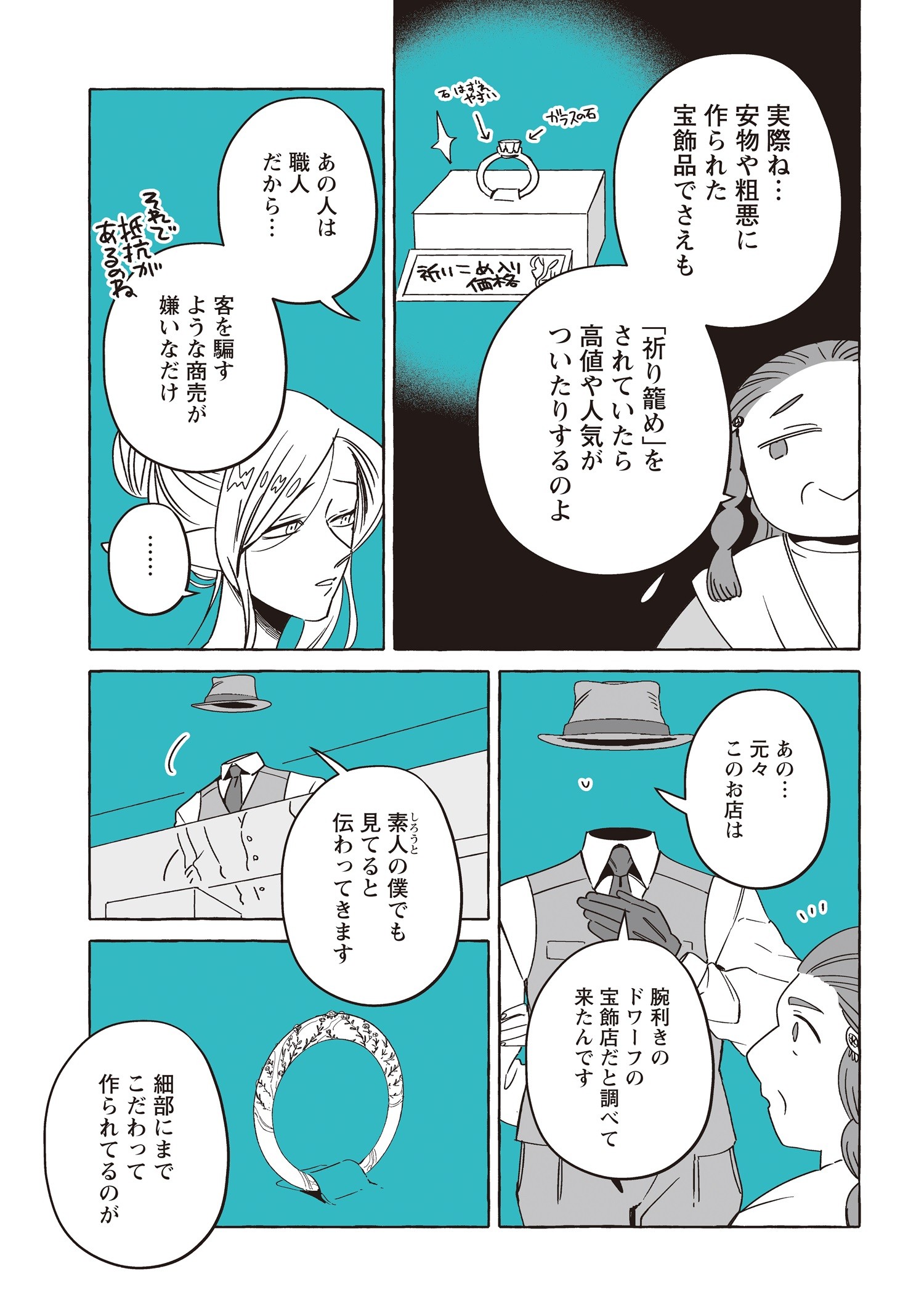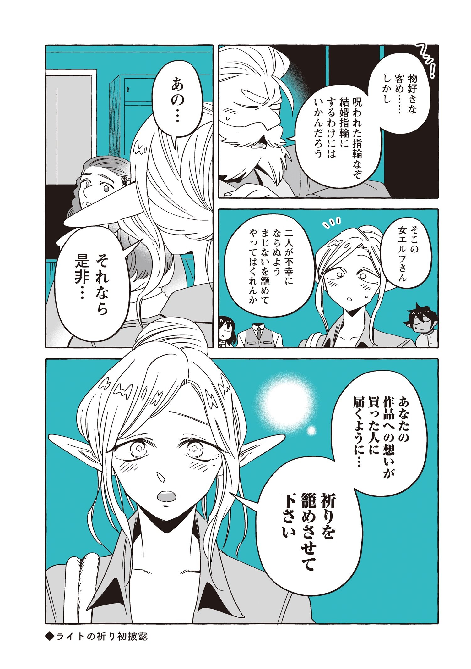 スマートで優しい探偵「透明男」透乃眼さんと、おっとりタイプで目の見えない「人間女性」夜香さんが同棲を始めて半年が経ち、2人は婚姻届を出す前に結婚指輪を作ることにします。カルマとライトに付き添ってもらい向かった宝飾店の店主は、エルフに敵意を持つ頑固なドワーフ職人でした。