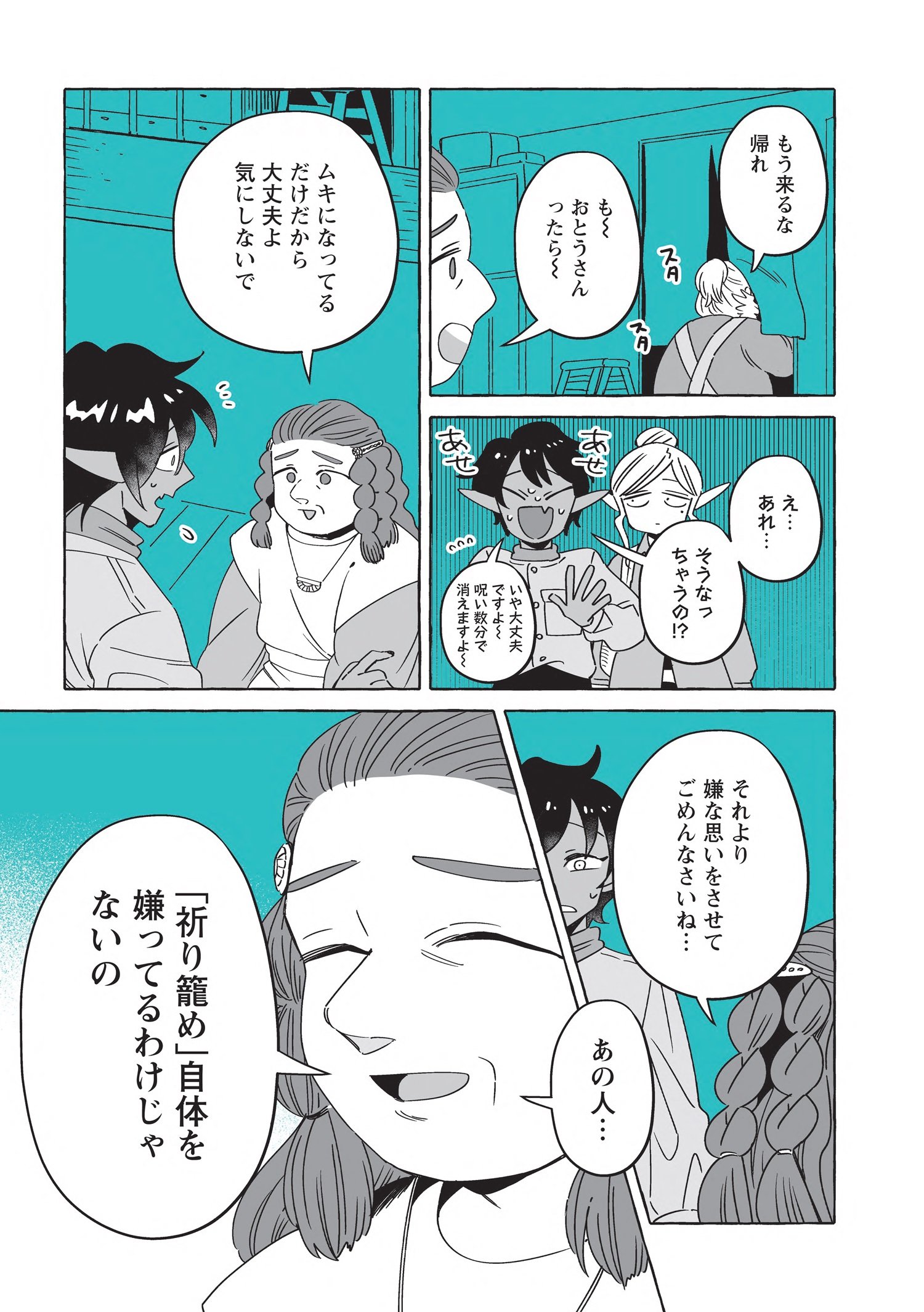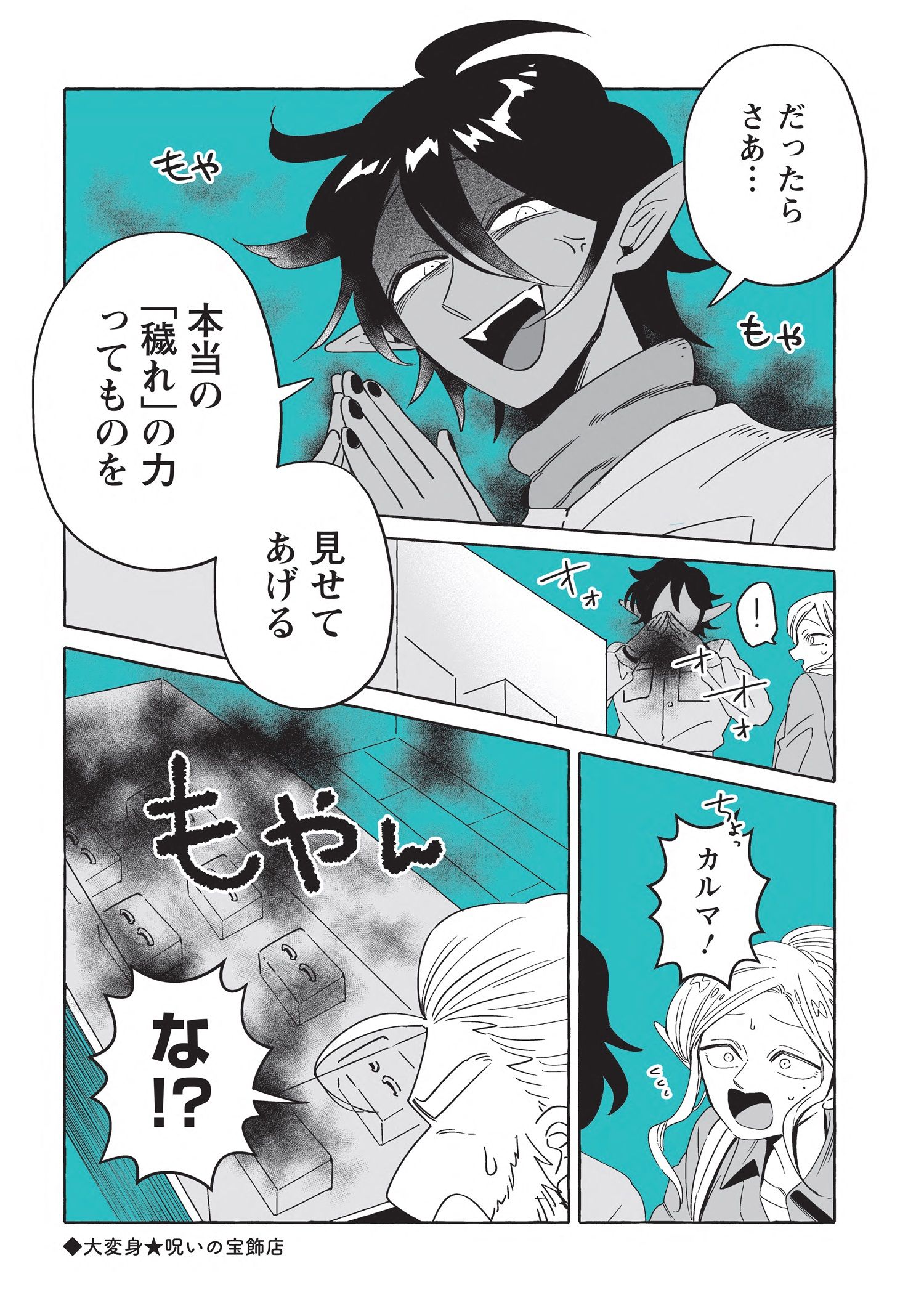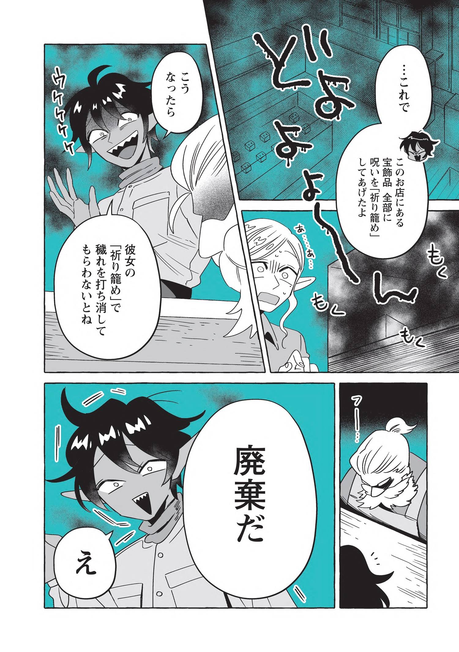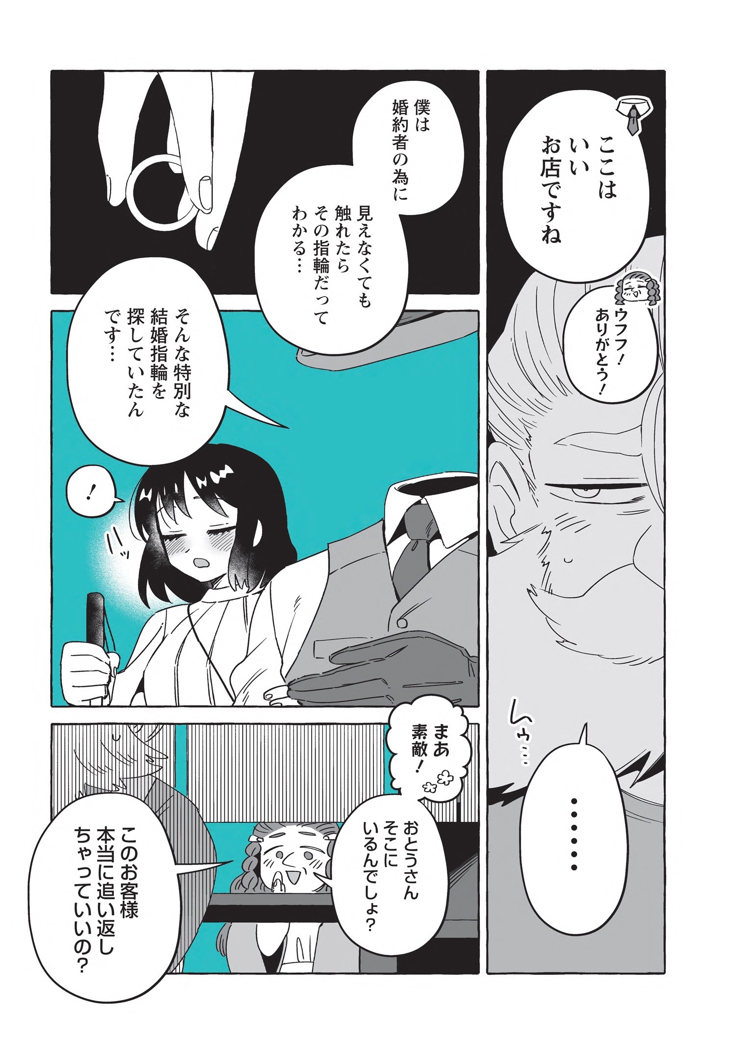 スマートで優しい探偵「透明男」透乃眼さんと、おっとりタイプで目の見えない「人間女性」夜香さんが同棲を始めて半年が経ち、2人は婚姻届を出す前に結婚指輪を作ることにします。カルマとライトに付き添ってもらい向かった宝飾店の店主は、エルフに敵意を持つ頑固なドワーフ職人でした。