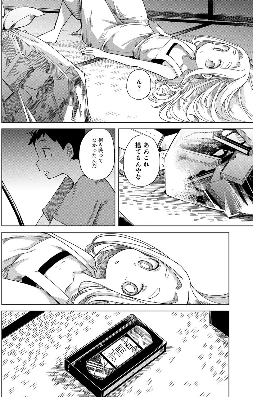 ヒマをもてあましていたジュンは、前の住人が残していった古いビデオテープを見つけてしまう。ああもう絶対怖いやつだよそれ! 悪いことは言わないから、触らないほうがいいよ……なーんていう90年代ホラーブームで散々怖い目に遭った私の声もむなしく、ジュンはビデオを見てしまい、怪異が始まる。まあ、夏休みだし、そりゃ見ちゃうよね。