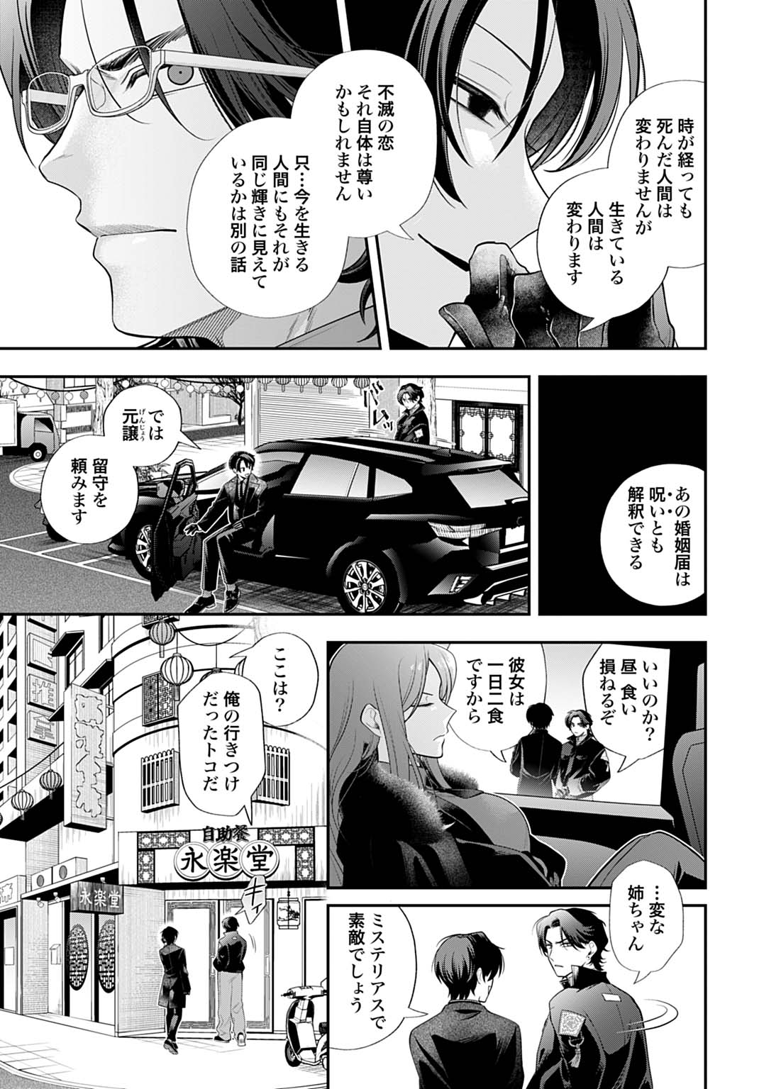 本作品は、「冥婚相談士」の呂色麗(ろいろうらら)が死者と婚姻を結ぶ「冥婚」を執り行い死と恋を見つめ直す人間ドラマです。不慮の事故で婚約者を亡くした宝飾職人の静は最愛の人に会いたい一心で冥婚式に興味を持ちますが…。