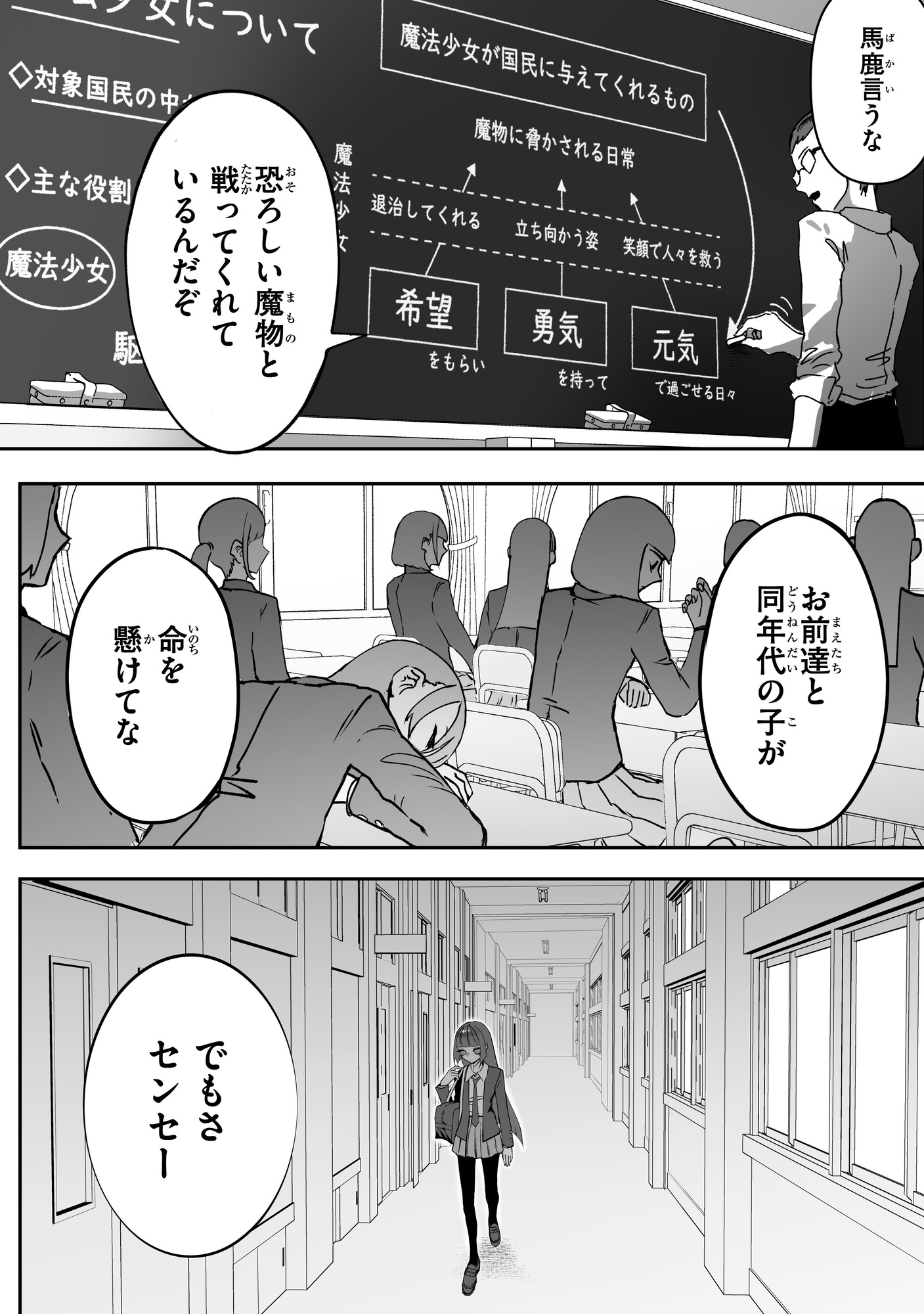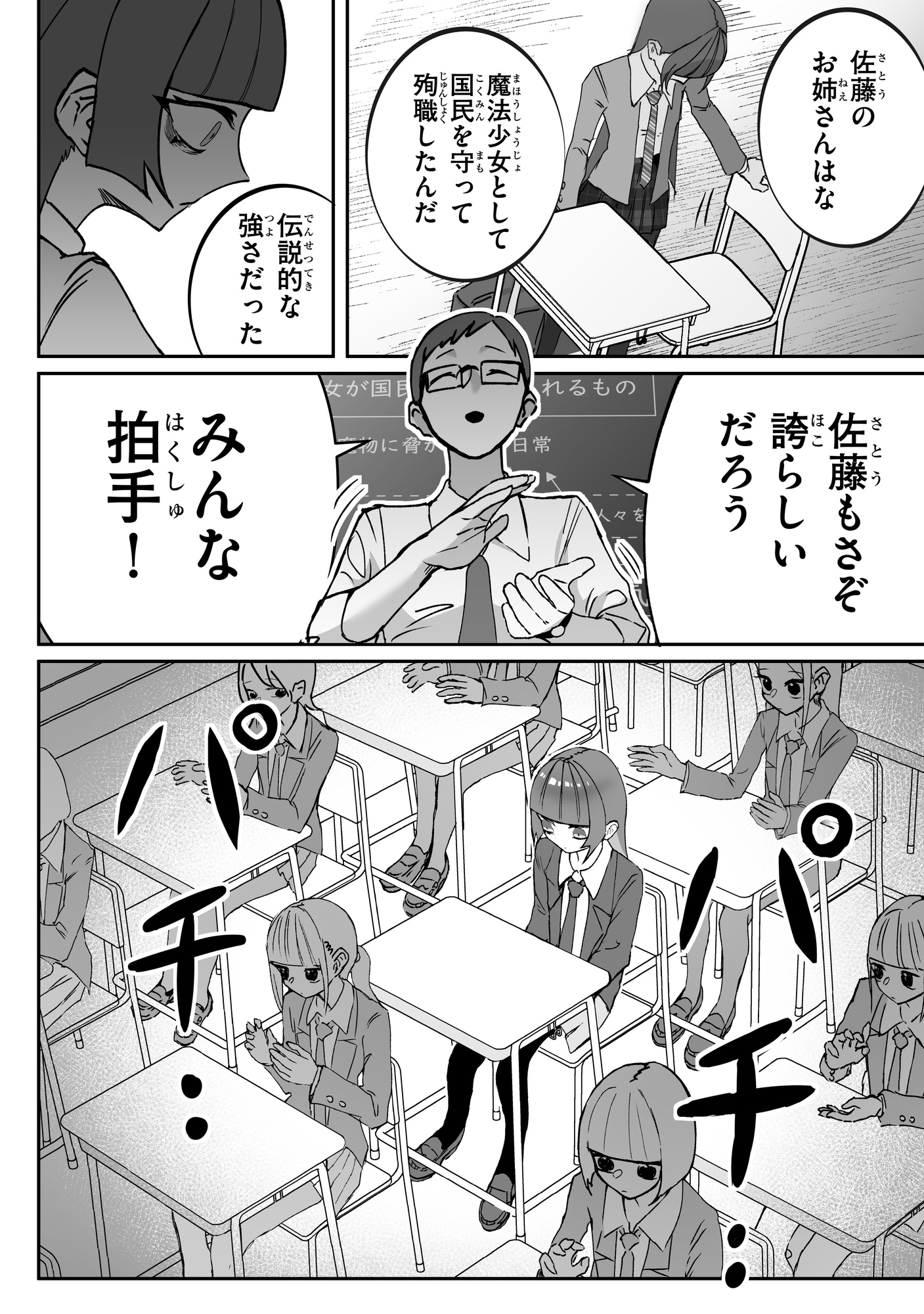 本作品は、不幸な魔法少女・佐藤青のバトルファンタジーです。魔法少女だった姉を魔物との戦いで亡くしてから、無気力な日々を過ごす高校生の青。思い出のブランコに座って亡き姉に思いを馳せていると、突然ひとりの魔法少女が現れ「お前は魔法少女に選ばれた」と宣言されて…。