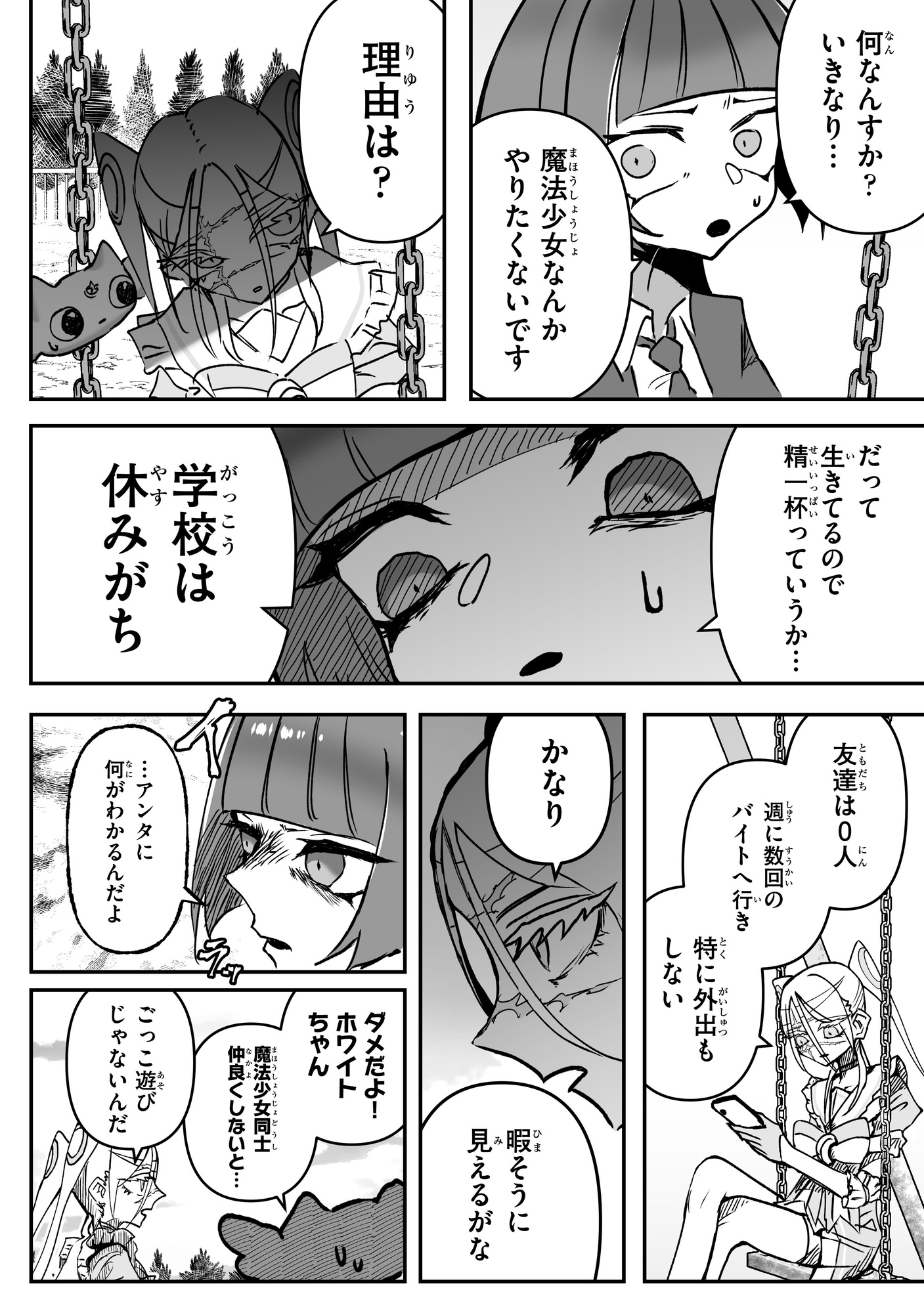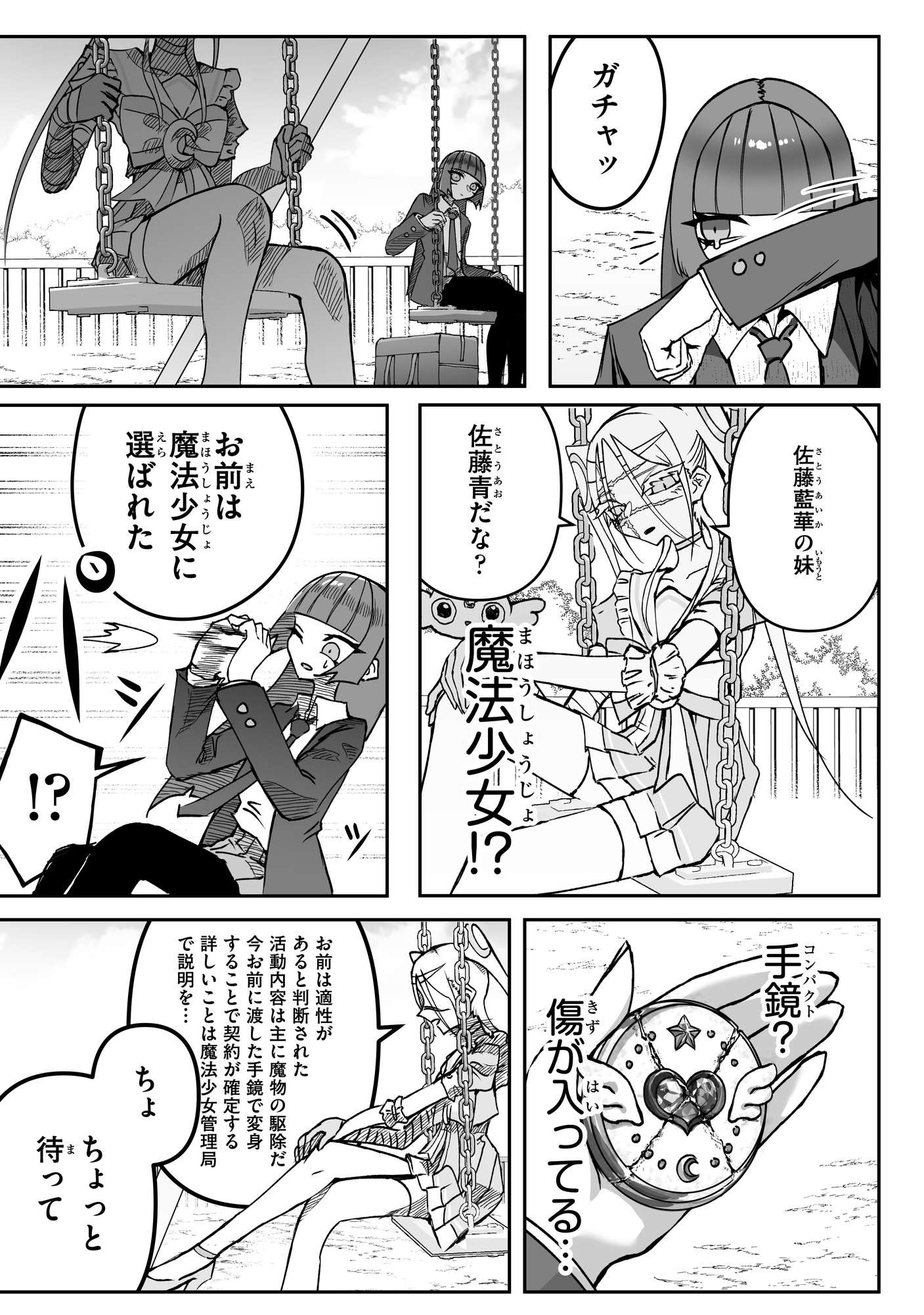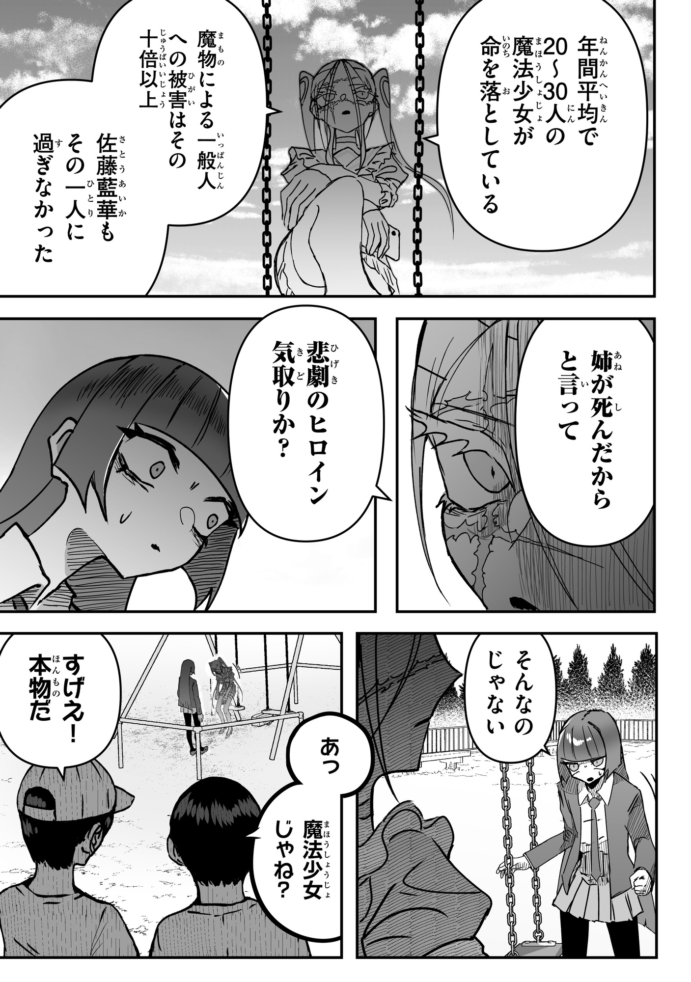 本作品は、不幸な魔法少女・佐藤青のバトルファンタジーです。魔法少女だった姉を魔物との戦いで亡くしてから、無気力な日々を過ごす高校生の青。思い出のブランコに座って亡き姉に思いを馳せていると、突然ひとりの魔法少女が現れ「お前は魔法少女に選ばれた」と宣言されて…。