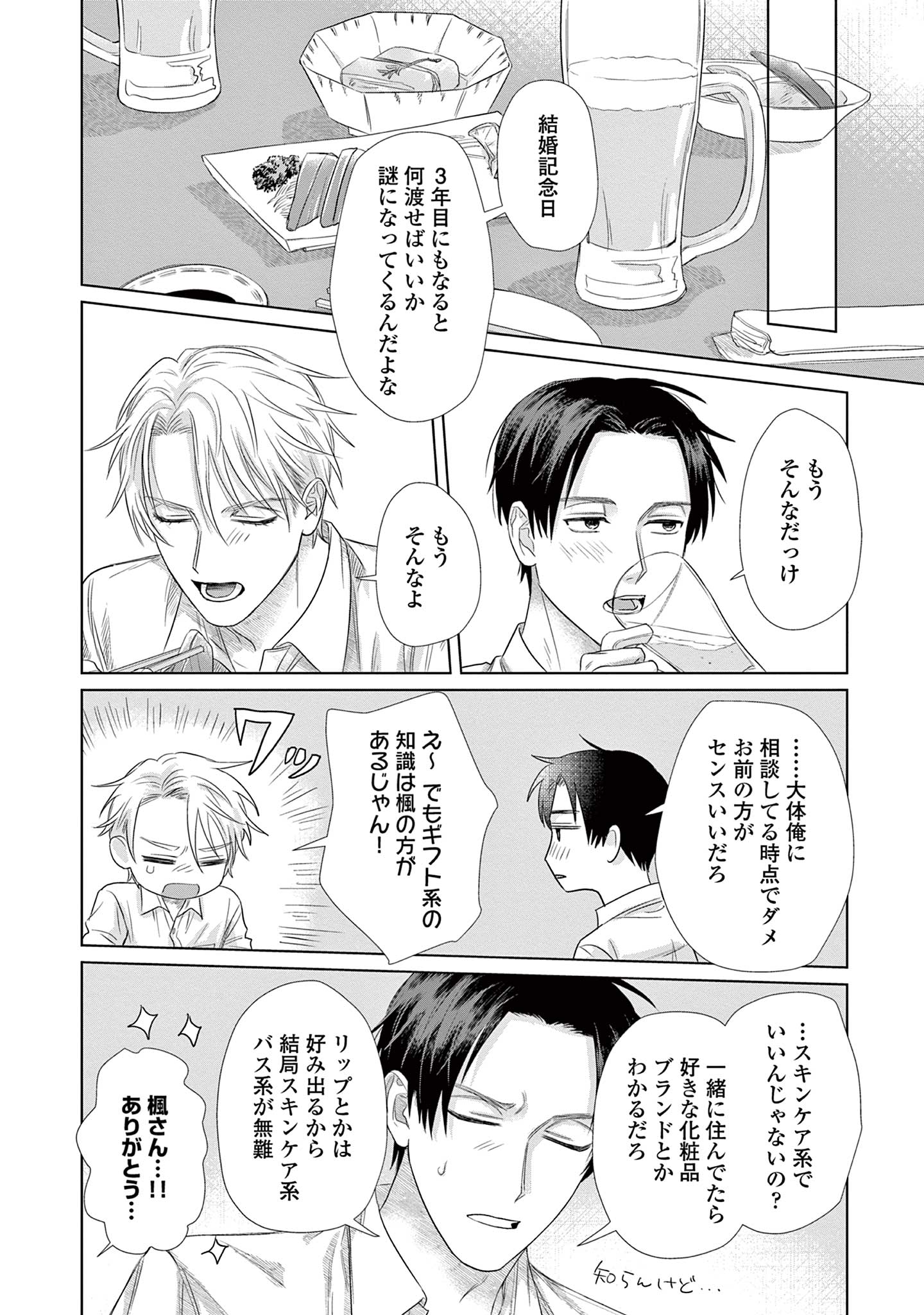 既婚の同期・三園に恋をしている楓は、不毛な恋愛を終わらせるため彼を遠ざけようとしますが、三園は意に介さず、自分自身に関する驚きの事実を告げます。