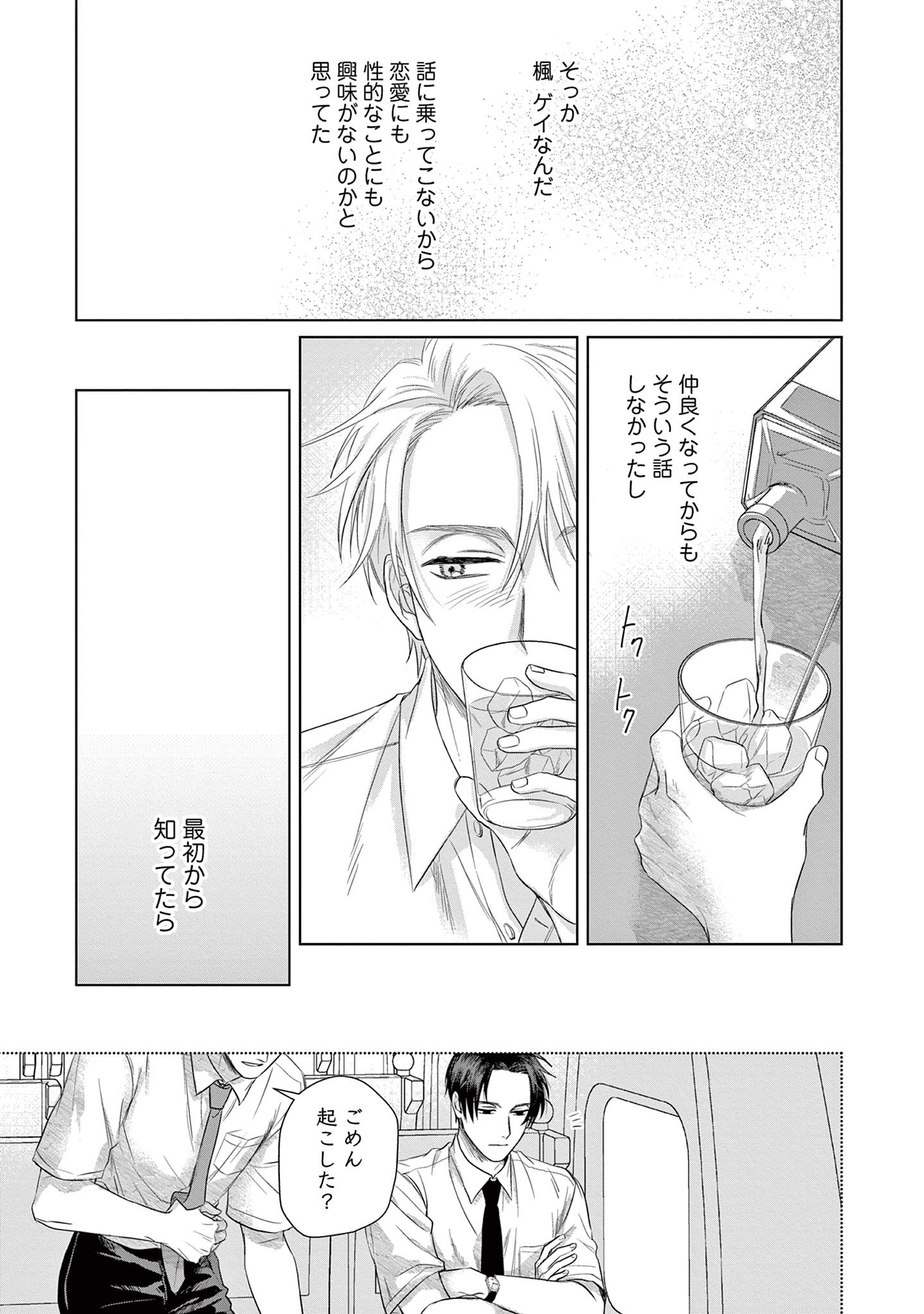 既婚の同期・三園に恋をしている楓は、不毛な恋愛を終わらせるため彼を遠ざけようとしますが、三園は意に介さず、自分自身に関する驚きの事実を告げます。