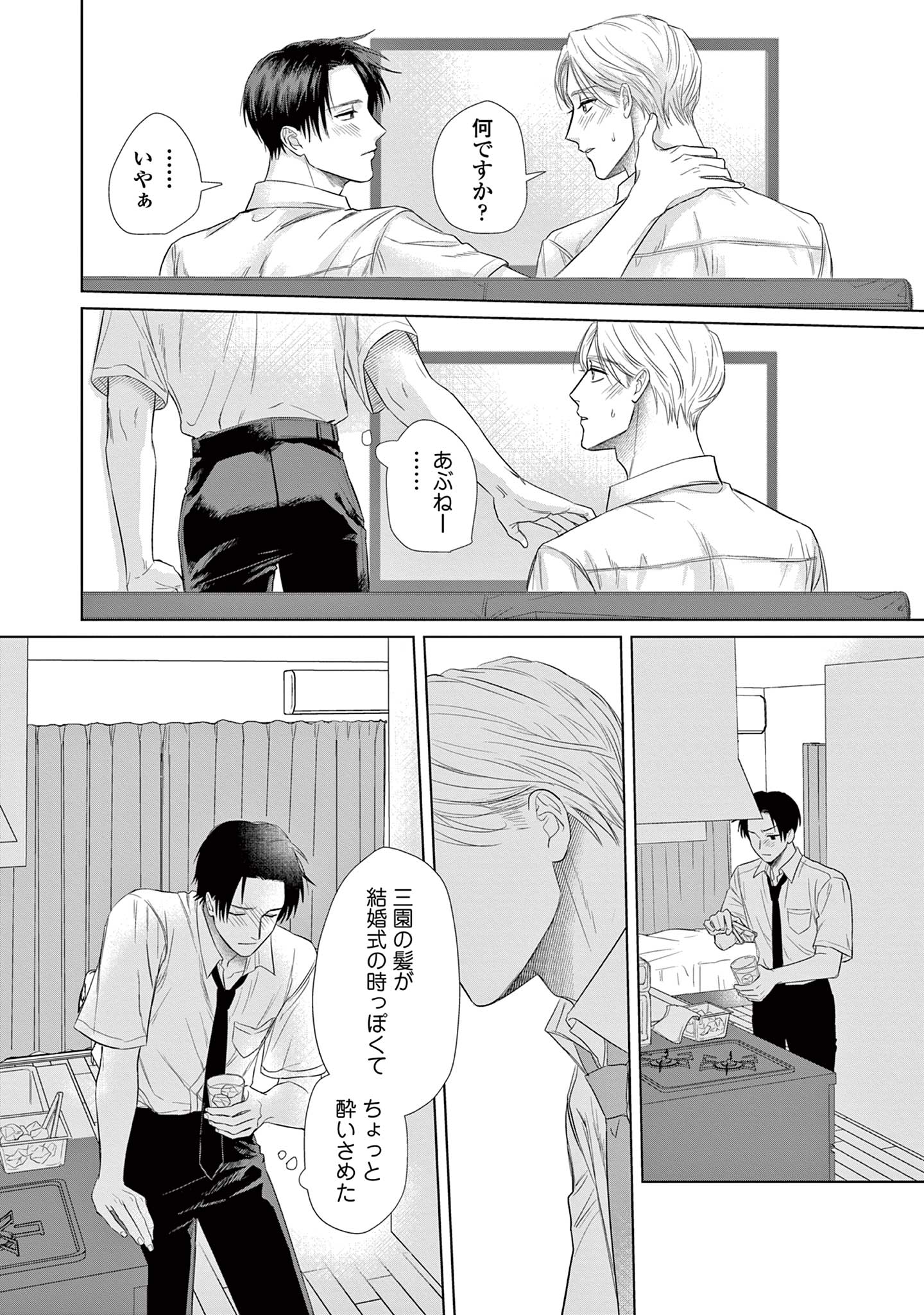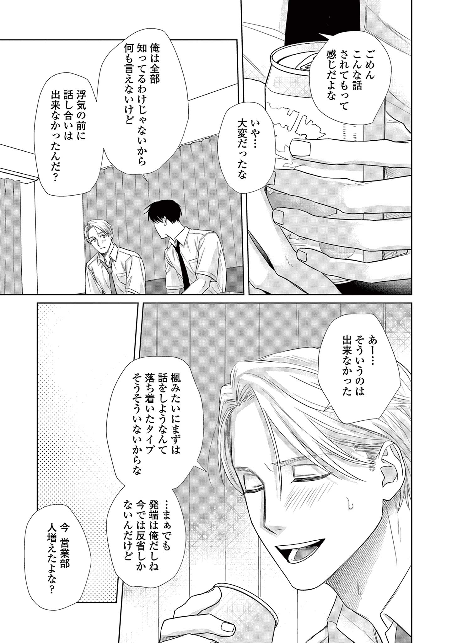 既婚の同期・三園に恋をしている楓は、不毛な恋愛を終わらせるため彼を遠ざけようとしますが、三園は意に介さず、自分自身に関する驚きの事実を告げます。