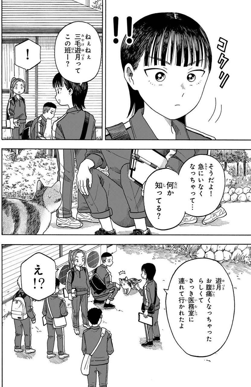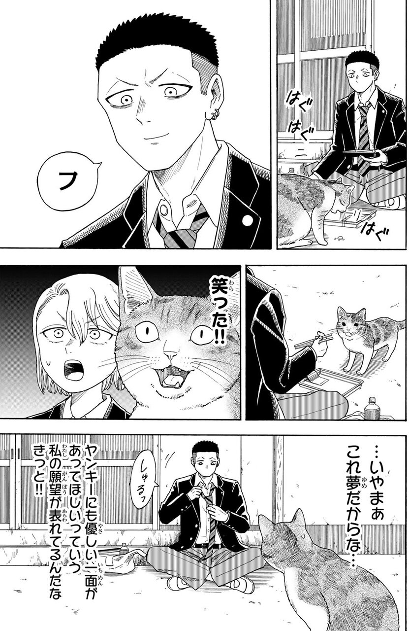 あまりに現実離れした現象に、遊月はこれを「夢」だと認識。学校に現れた猫に群がり、「かわいい!」と、触りまくる女子高生軍団から逃れた先には、クラスメイトのヤンキー・夏梅(なつうめ)が。彼は怯える猫(遊月)に、お弁当のおかずを分け与えます。最初は警戒するものの、いい匂いに抗えずおかずをぱくつく遊月。