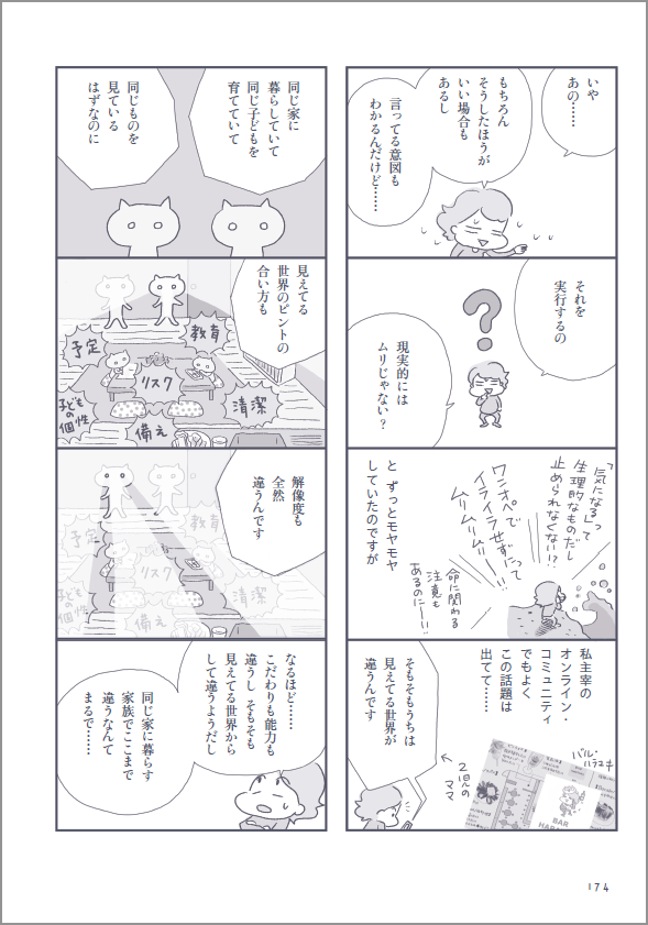 育児をしていると、どうしても視野が自分たちの家庭だけに狭まりがちです。しかし、ハラユキさんが取材で出会った国内外の多様な家庭の事例に触れると、「みんな試行錯誤しながら育てているんだ」と安心でき、勇気をもらえます。もちろん、すべての事例がそのまま自分の家庭に当てはまるわけではありません。それでも本書の31のヒントの中に、きっと自分たちのモヤモヤに近いものが見つかるはずです。