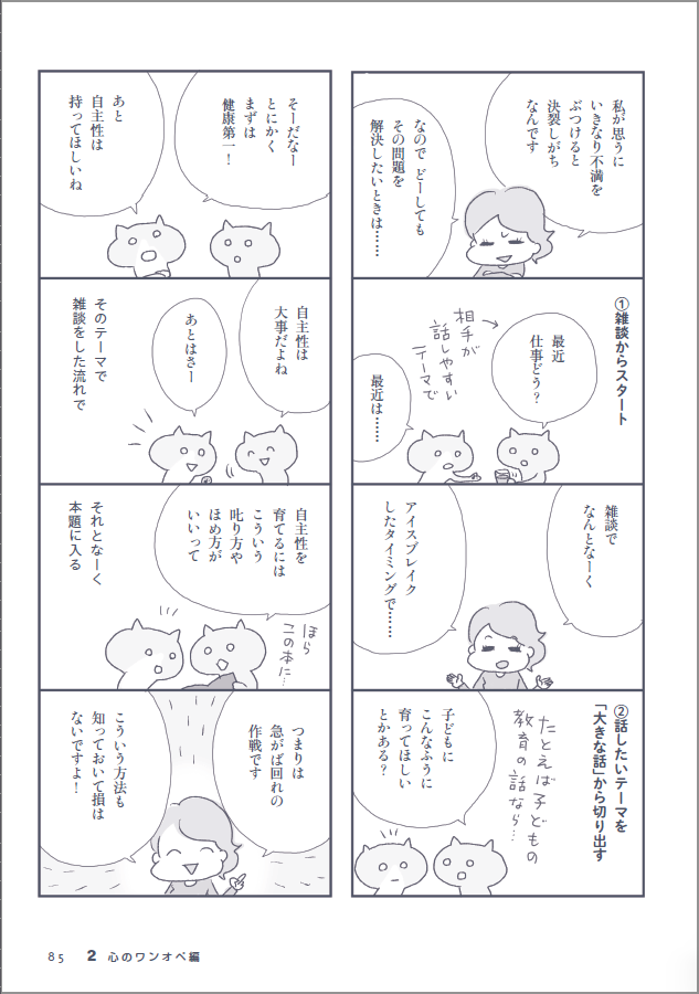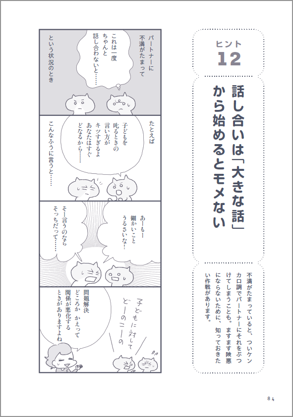 さらに<ヒント12「話し合いは「大きな話」から始めるとモメない>も目からウロコでした。子どもに笑顔でのびのび育ってほしい――そんな共通の願いをまず確認したうえで話し合いをしていきたい、と前向きな気持ちになりました。
