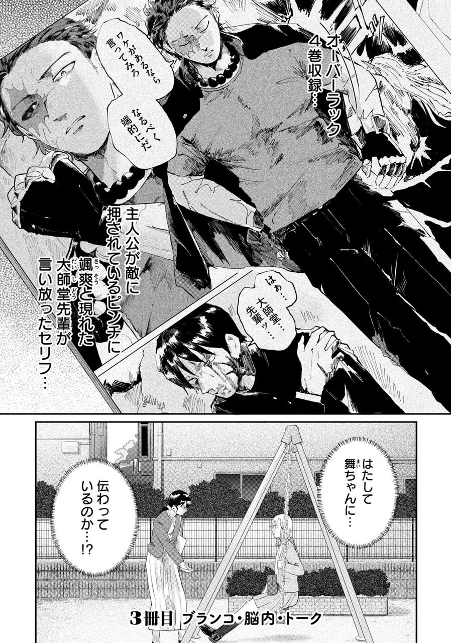 「オタクは推しを語るとき早口になる」という状態を、フキダシ一杯の文字で表現するパターンはこれまでにも多くの作品で描かれてきました。しかし、ここまで文字を詰め込むとは。老眼な身には厳しいフォントサイズながら、舞がどっぷりと沼っており、相当コアなオタクであることがビンビン伝わってきます。