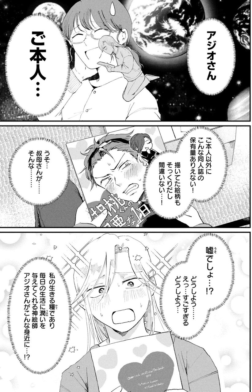 クールな姪に、アラサーニートな叔母がオタクだとバレるなんて、周子からすれば最悪のシナリオ。でも舞は、叔母が神絵師・アジオというミラクルに、大興奮。「アジオの作品が生きる希望」という舞の想いも周子に伝わり、これまでぎくしゃくしていたふたりが、晴れてオタ友という関係性を築くことに成功。
