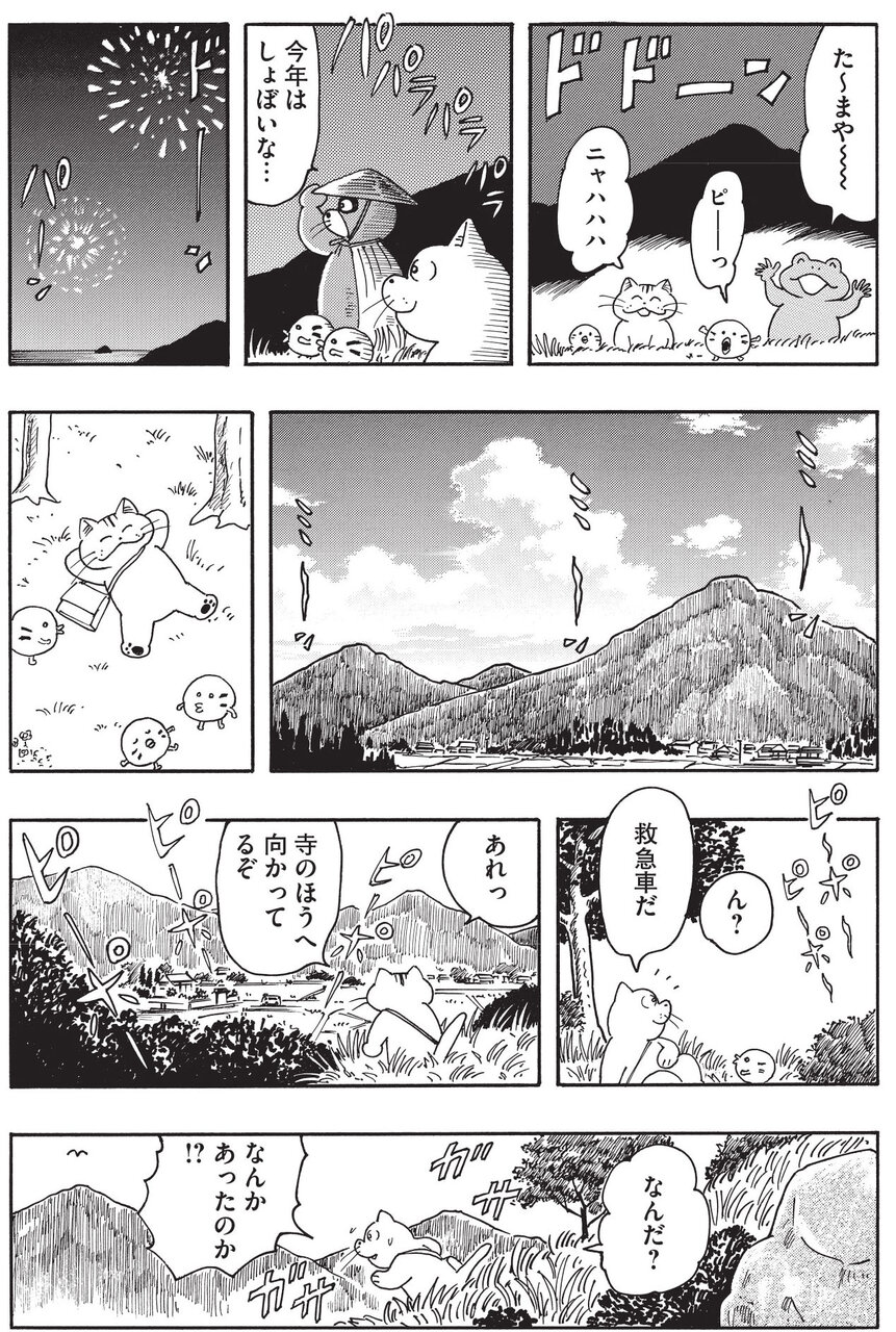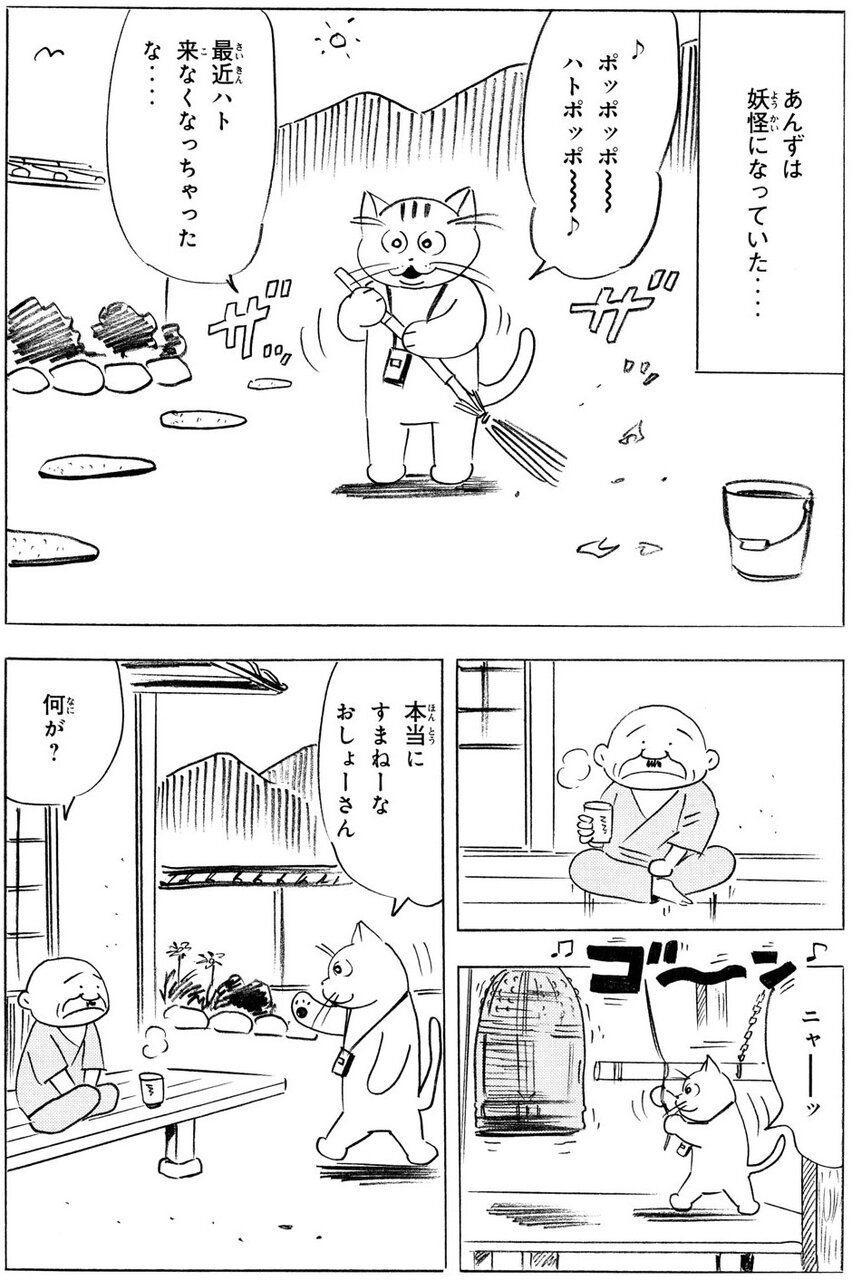 なぜか化け猫となった。ニャーッとも言うが、二足歩行で日本語をしゃべるしゃべる。バイクだってブンブン乗り回す。和尚さんもおかみさんも、あんずちゃんと30年も一緒にいるから「まあ化け猫になっちゃうよな」といった具合に妖怪化を受け入れている。