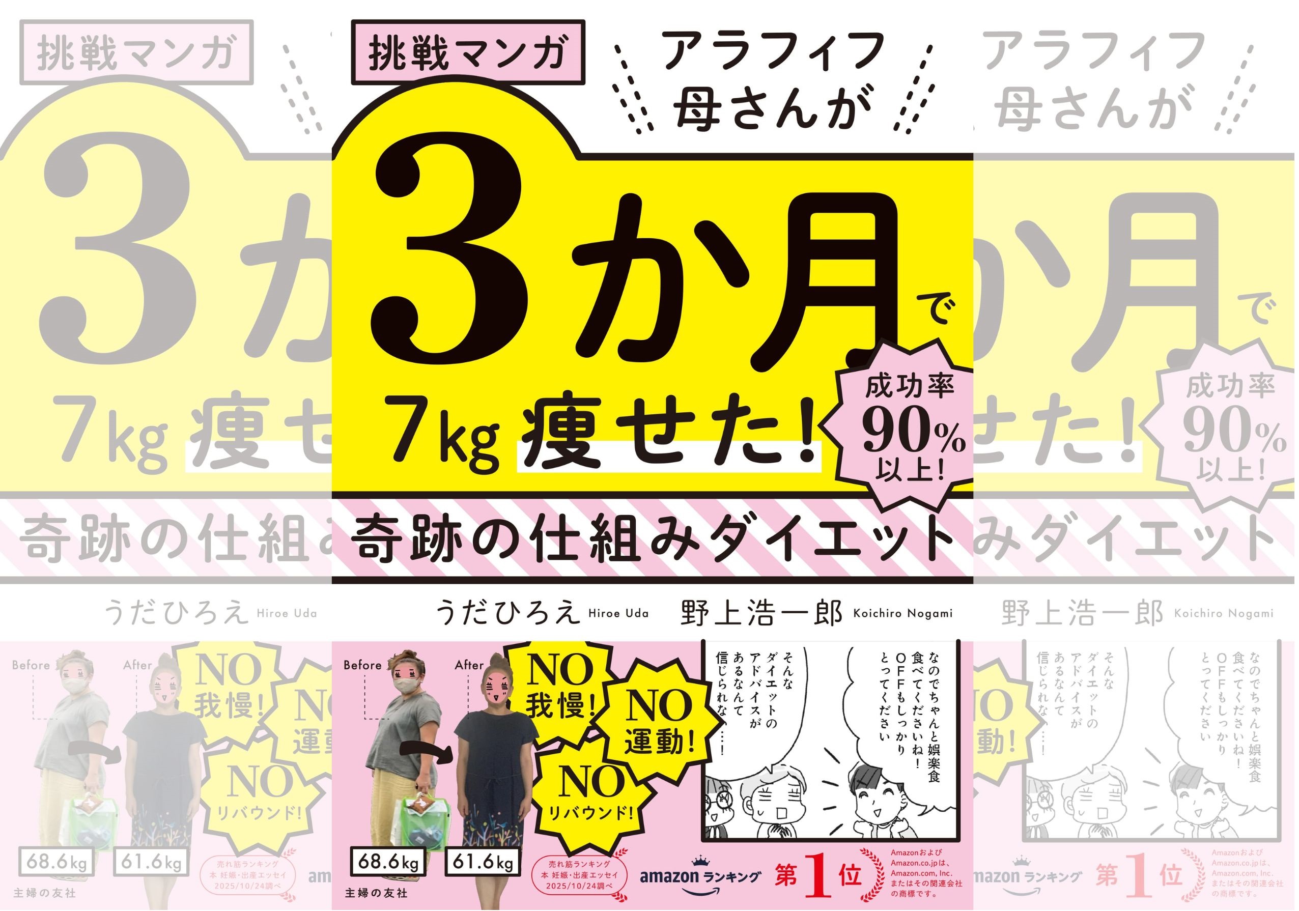 アラフィフでも3か月で7kg痩せた実体験をマンガ化した『挑戦マンガ アラフィフ母さんが3か月で7kg痩せた! 奇跡の仕組みダイエット』が11月27日(木)に発売されました。