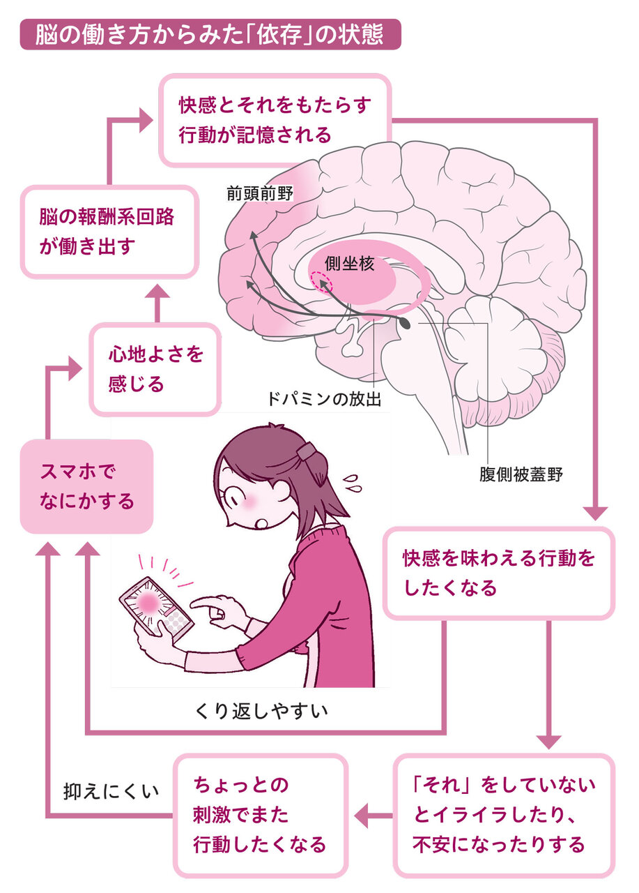 たとえば、スマホでネットニュースなどを眺めているときに“いいこと”に混ざって“悪いこと”が目に入ることさえ、人の脳にとっては快感になるという。またスマホでできるゲームやSNS、ギャンブルには、ユーザーが「夢中になる」「手放せなくなる」「くせになる」ための工夫が凝らされている……といったことが解説されている。この「依存を生むしくみ」が頭のどこかにあるだけで、「そろそろまずいかも」と踏みとどまるきっかけになるかもしれない。