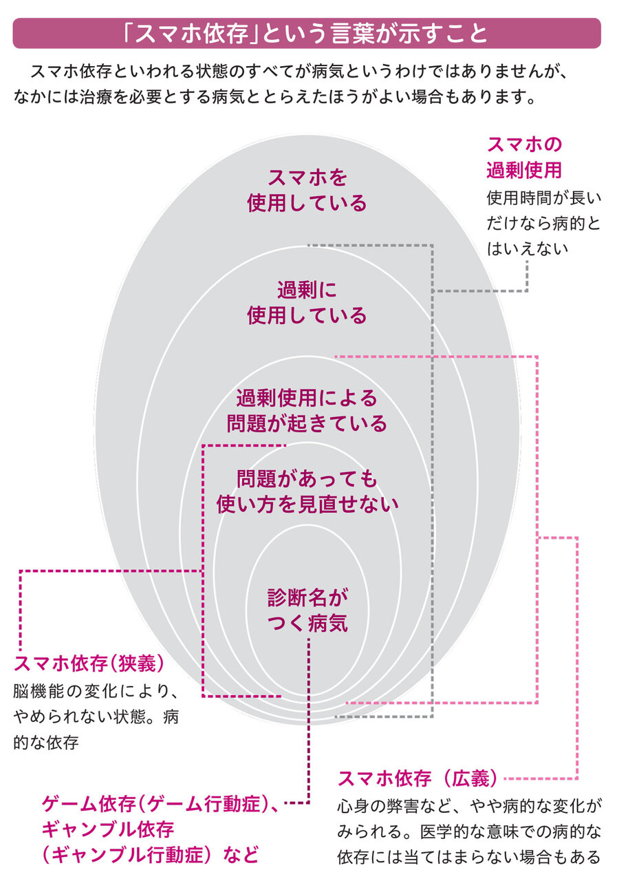 できることが多岐にわたるゆえに曖昧になりがちな「スマホ依存」という言葉。これが指すものに加え、「どこからが病気なのか」という境界線を明確にしているのが本書の特徴だ。