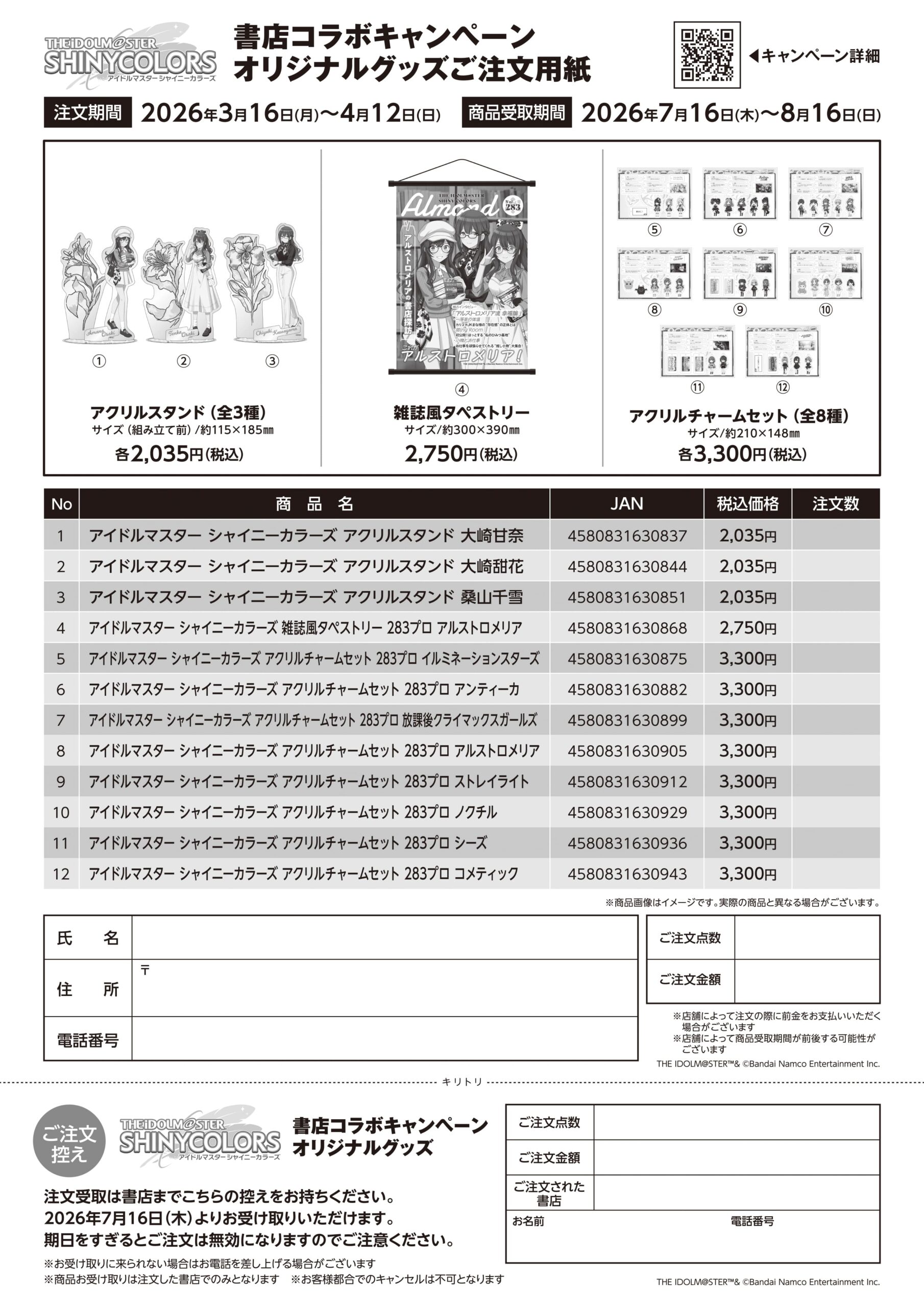 キャンペーン期間中、開催店舗のうち一部の書店店頭と一部ECサイトにて、オリジナルグッズの受注販売を実施します。グッズはアンバサダーの「アルストロメリア」3人をデザインした「アクリルスタンド」(全3種)と「雑誌風タペストリー」(全1種)、283プロダクション全8ユニットの「アクリルチャームセット」(全8種)です。「アクリルチャームセット」 は、ボールチェーンでセリフやアイドルを自由に組み合わせてお楽しみいただけます。