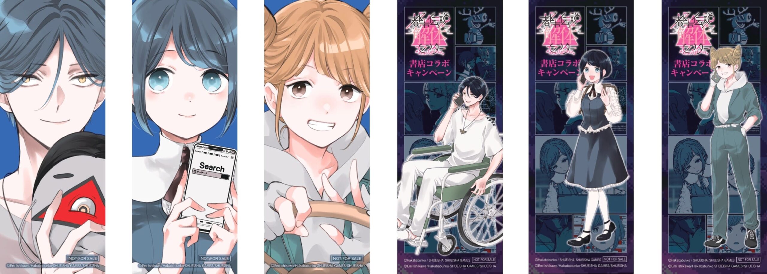 オリジナルしおり全6種のうち、3種は書店コラボ限定のイラストを使用しています。片面はゲーム「都市伝説解体センター」開発チームの墓場文庫によるコラボ限定イラスト、もう片面にはりぼんで連載中のコミカライズ作品『都市伝説解体センター Parallel File』の作者・いしかわえみさんによる新規描き下ろしイラスト3種がデザインされています。ゲームとコミカライズ、それぞれの魅力が1枚で楽しめる豪華仕様です。
