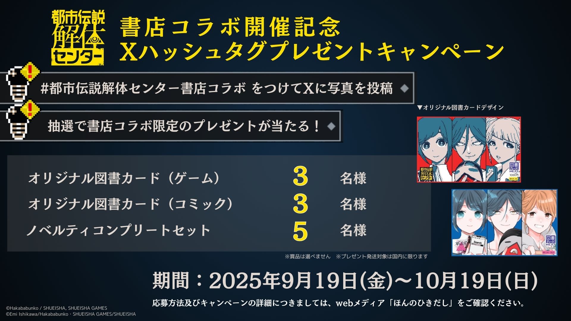 ハッシュタグ「#都市伝説解体センター書店コラボ」を付けて、X(旧:Twitter)で書店で受け取ったオリジナルしおりの写真を投稿いただくと、抽選で「都市伝説解体センター」の書店コラボ限定描き下ろしイラストを用いた図書カードや、オリジナルしおりのコンプリートセットが当たります。