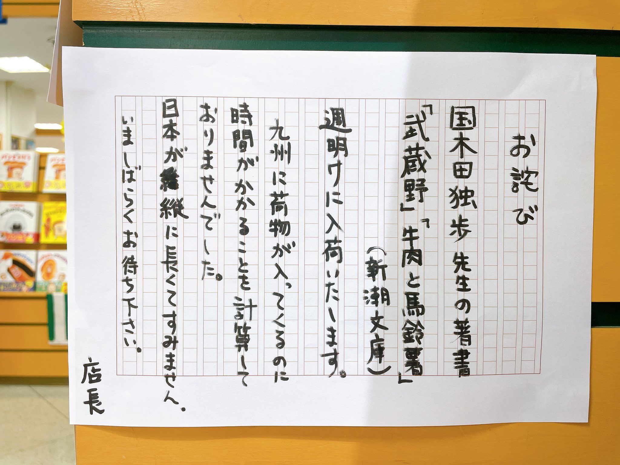 こちらは第1回のコラボ時に、文豪関連書籍のミニフェア用の商品着荷が間に合わず、当時の店長が書いてくれたお詫び文です。